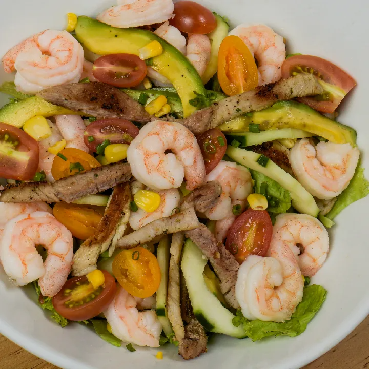 Base de lechuga fresca tomate cherry maíz tierno camarones y bondiola a la parrilla acompañada de vinagre balsámico y aceite de oliva.
