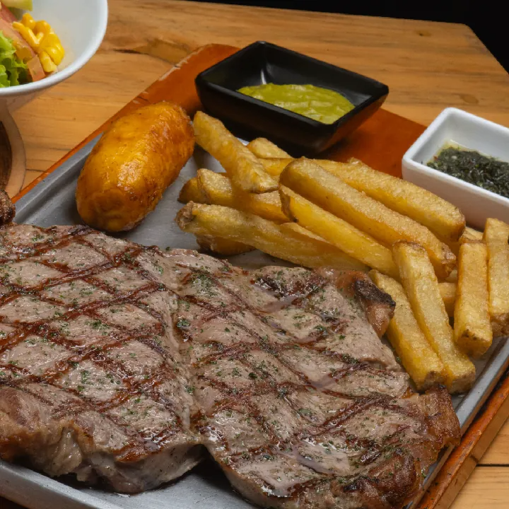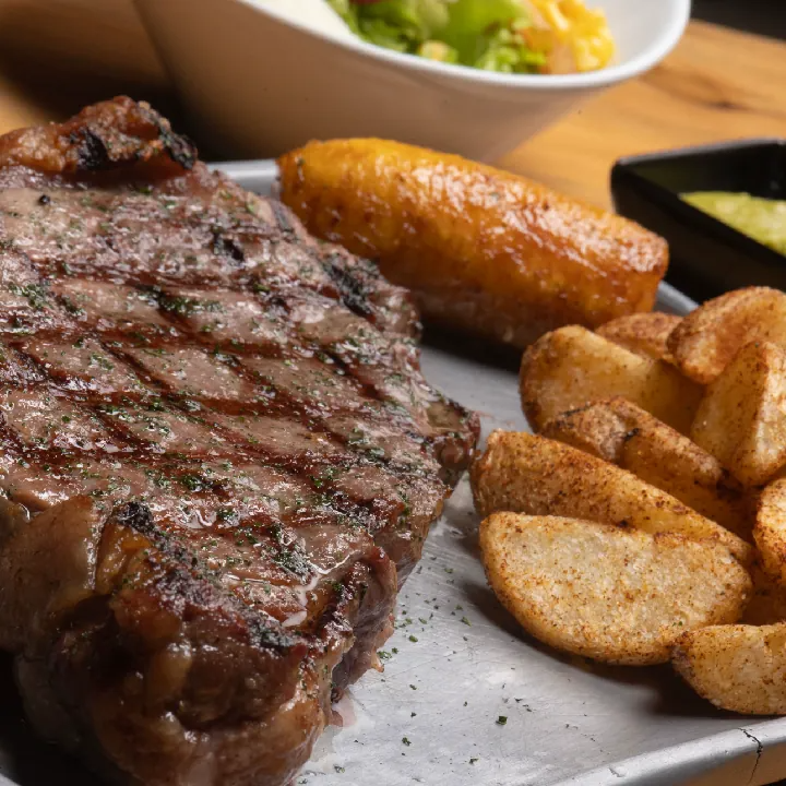 Delicioso bife chorizo acompañado de papa rústica maduro chimichurri y salsa de la casa.