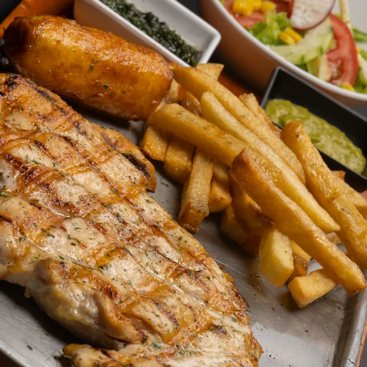 160 gr de pechuga de pollo a la parrilla Acompañado de papas, ensalada, maduro, chimichurri y guacamole.