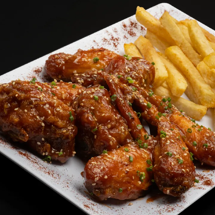 6 Deliciosas alitas en salsa BBQ acompañadas de papas a la francesa.