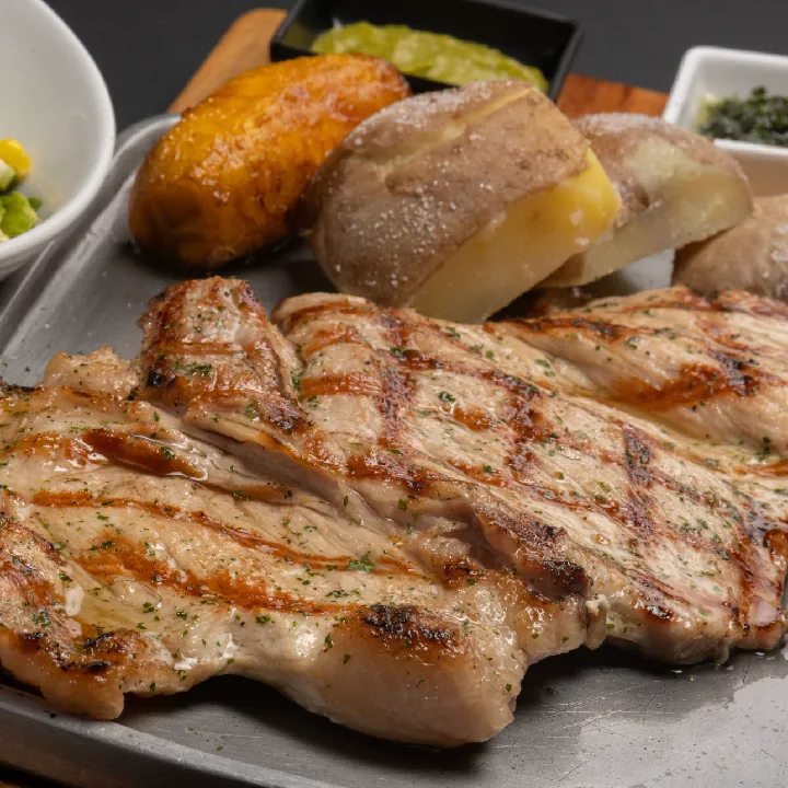 Deliciosa bondiola acompañada de papa al vapor maduro salsa de la casa y chimichurri.