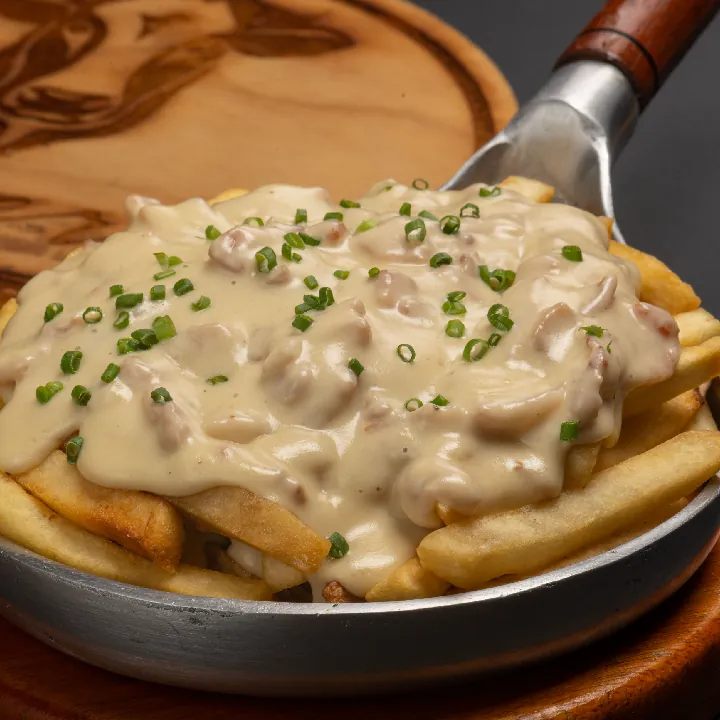 Deliciosas papas a la francesa con ligera base de sour cream bañadas en queso trozos de tocineta y lluvia de cebollín.