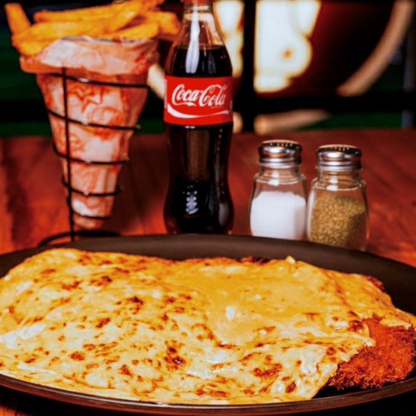 Milanesa Napolitana gratinada, crocante por fuera y jugosa por dentro, cubierta con salsa de Napolitana, salsa bechamel y queso gratinado, acompañada de papas a la francesa doradas y crujientes. Un clásico irresistible