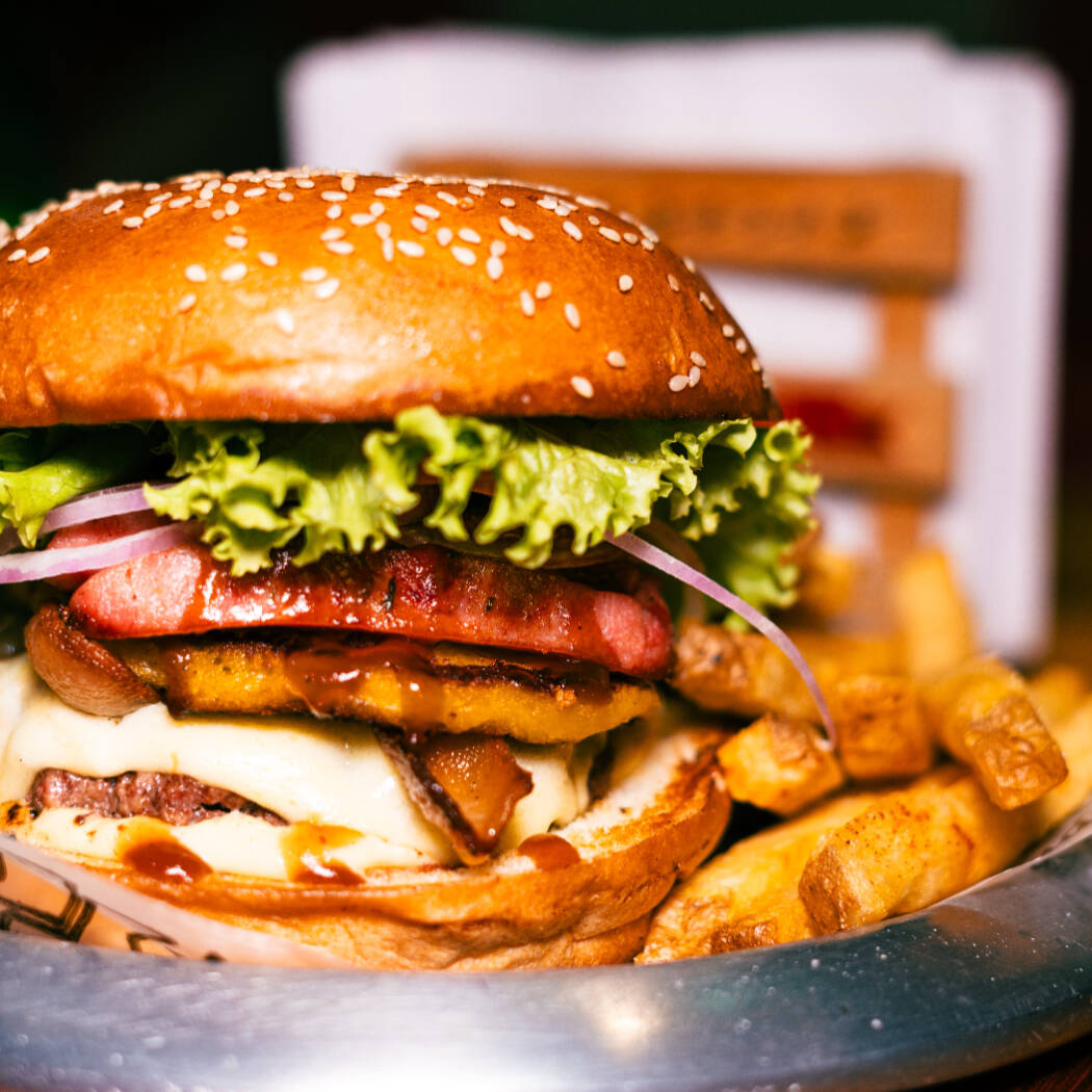 160 g de carne, chorizo santarrosano, tocineta artesanal, maduro guayabo y BBQ de guayaba con salsa de ajo. Pura montaña colombiana.