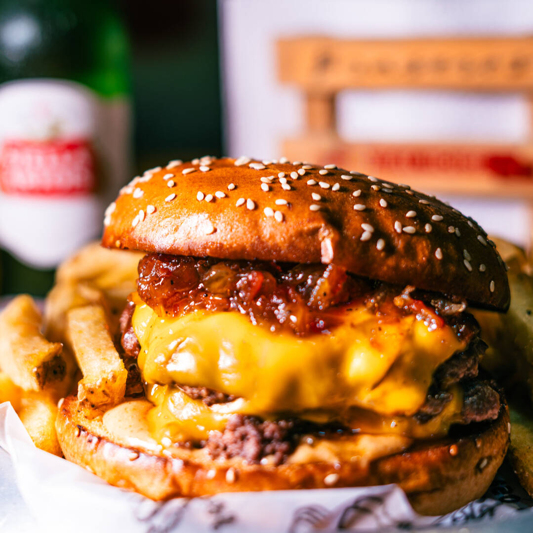 Smash burger 2x patties de 110 gr cada uno, con queso Americano y cebolla caramelizada. Jugosa, intensa y llena de sabor.
