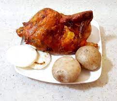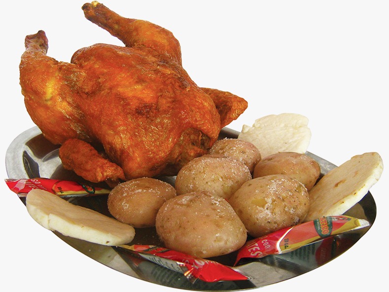 1 Pollo Entero (presa sujeta a disponibilidad), acompañado de maduros o papas o arepa pequeñas