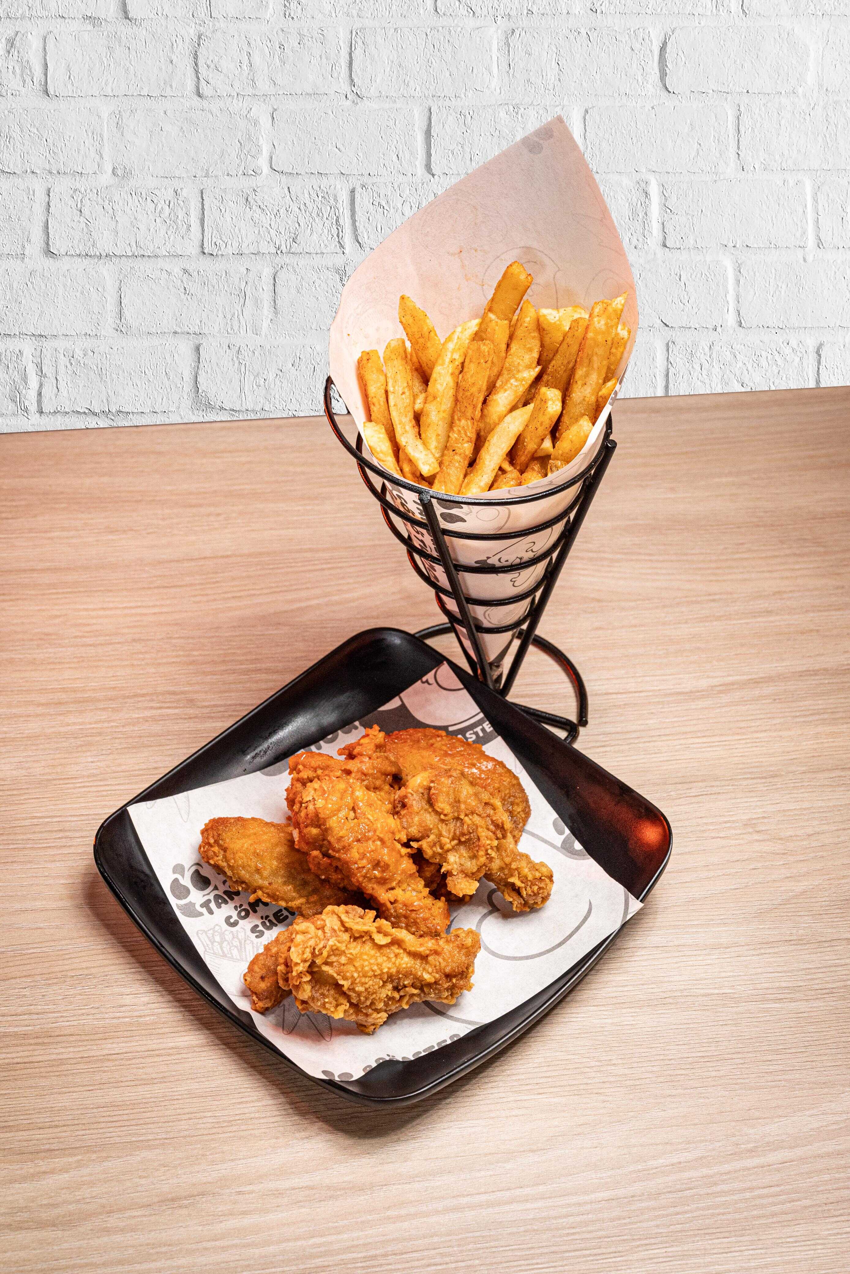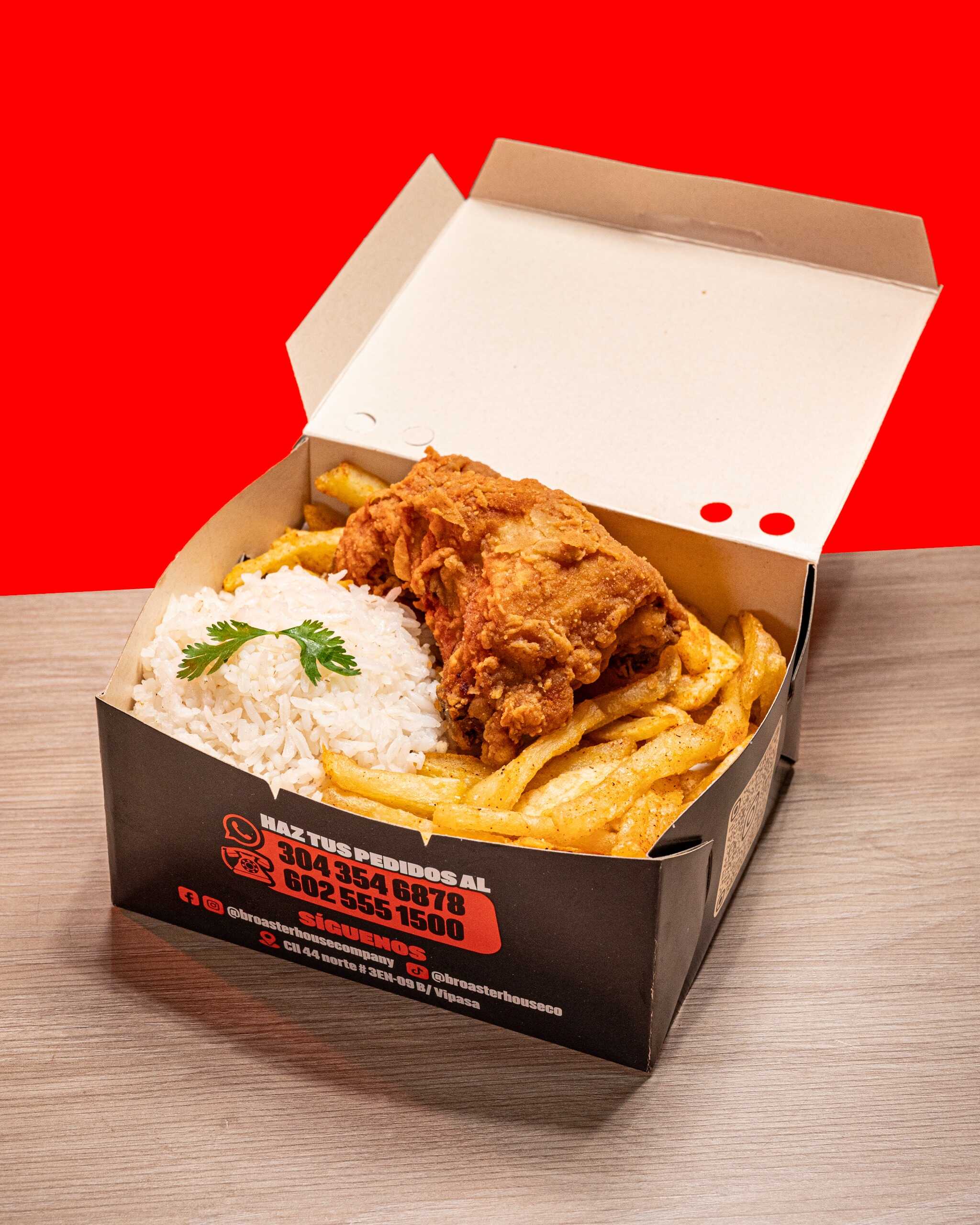 Platillo Individual: contiene una jugosa y pequeña presa de pollo a la broaster (muslo o contramuslo, según disponibilidad), acompañada de papas a la francesa (140 g) y una porción de arroz. No incluye salsas.