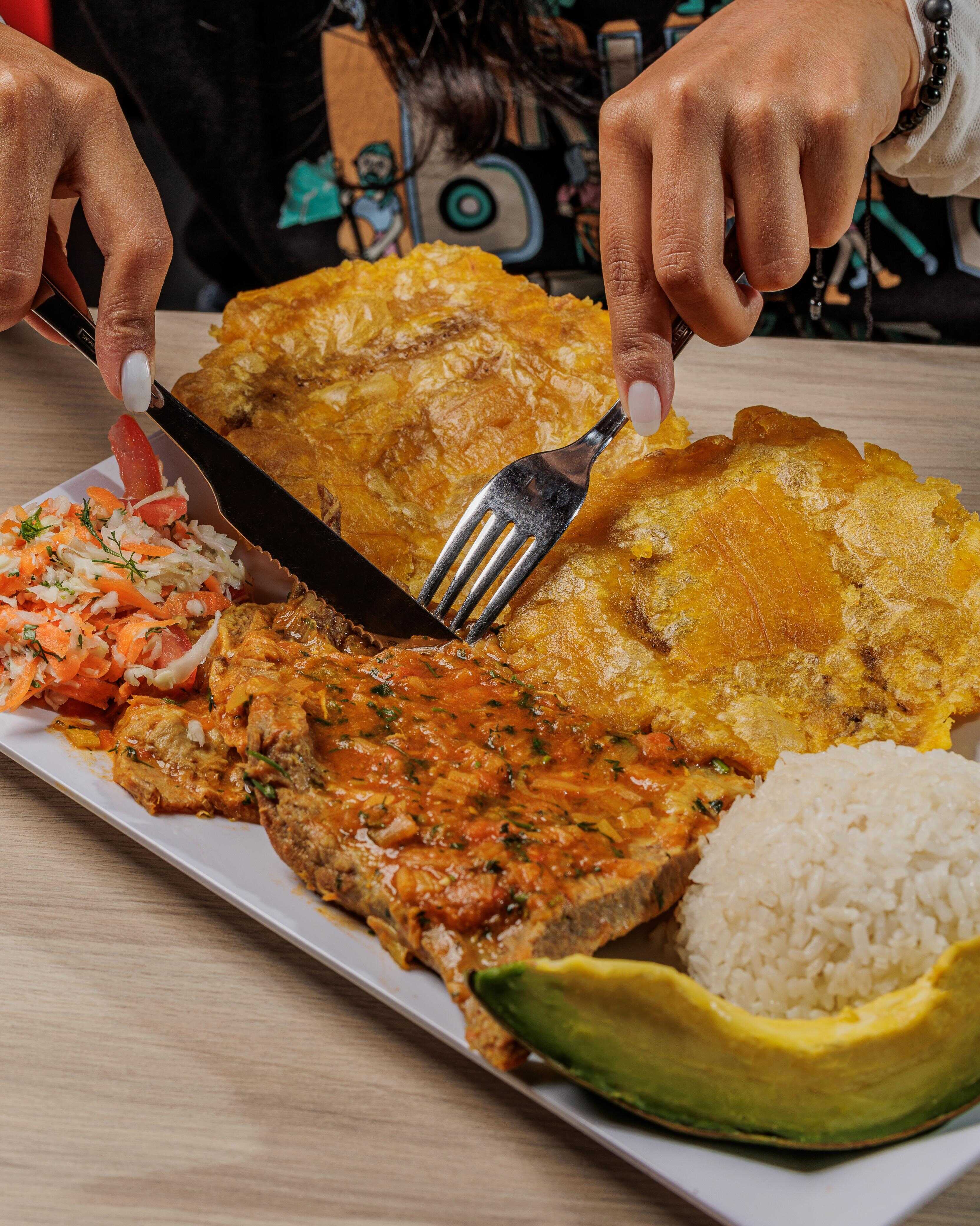 Deliciosa sobrebarriga a la criolla, acompañada de tostadas de plátano, ensalada, aguacate y arroz blanco.