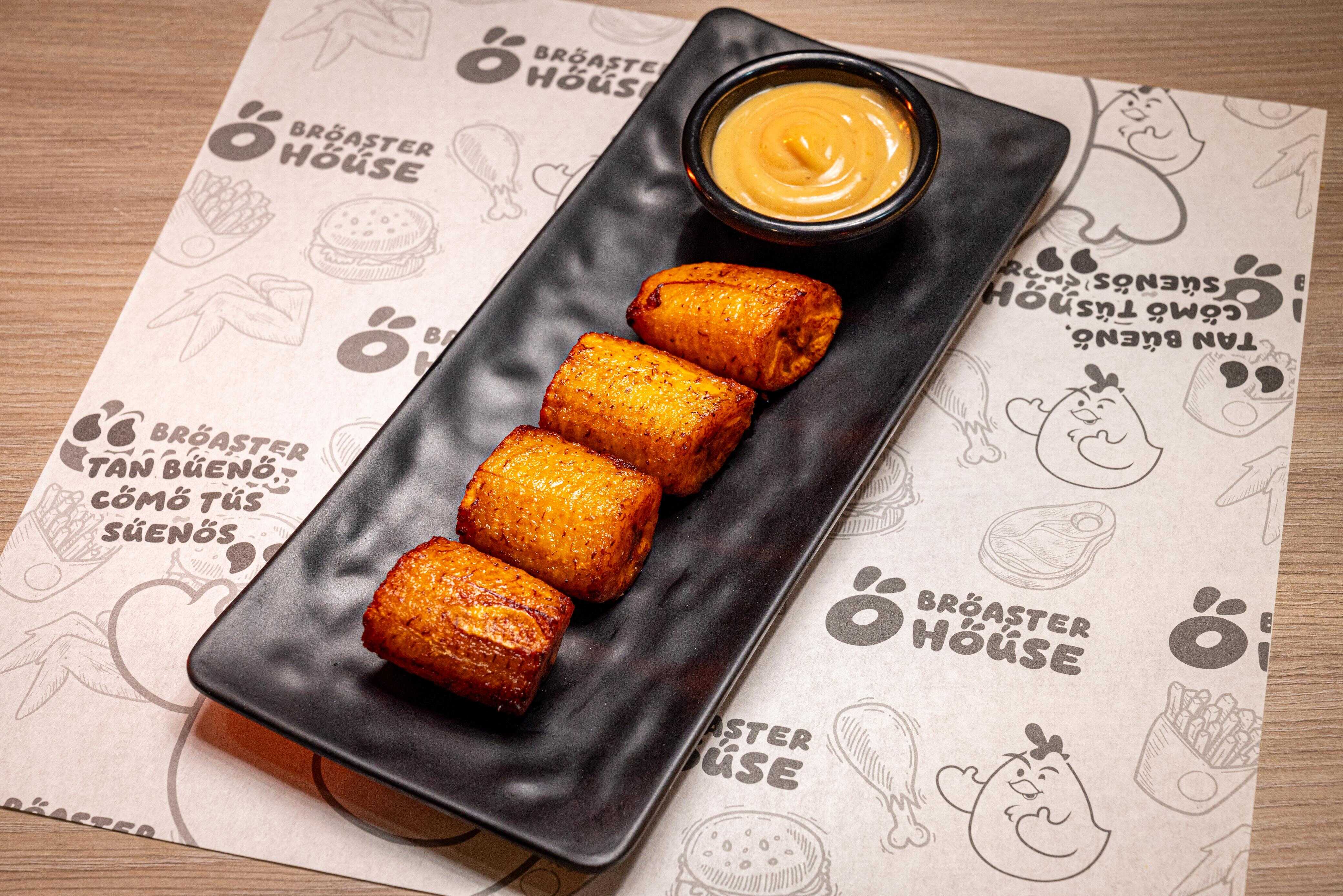 Chicken Tenders en trozos, base de arroz colorido, papas a la francesa, salsa de queso, salsa BBQ japonesa.