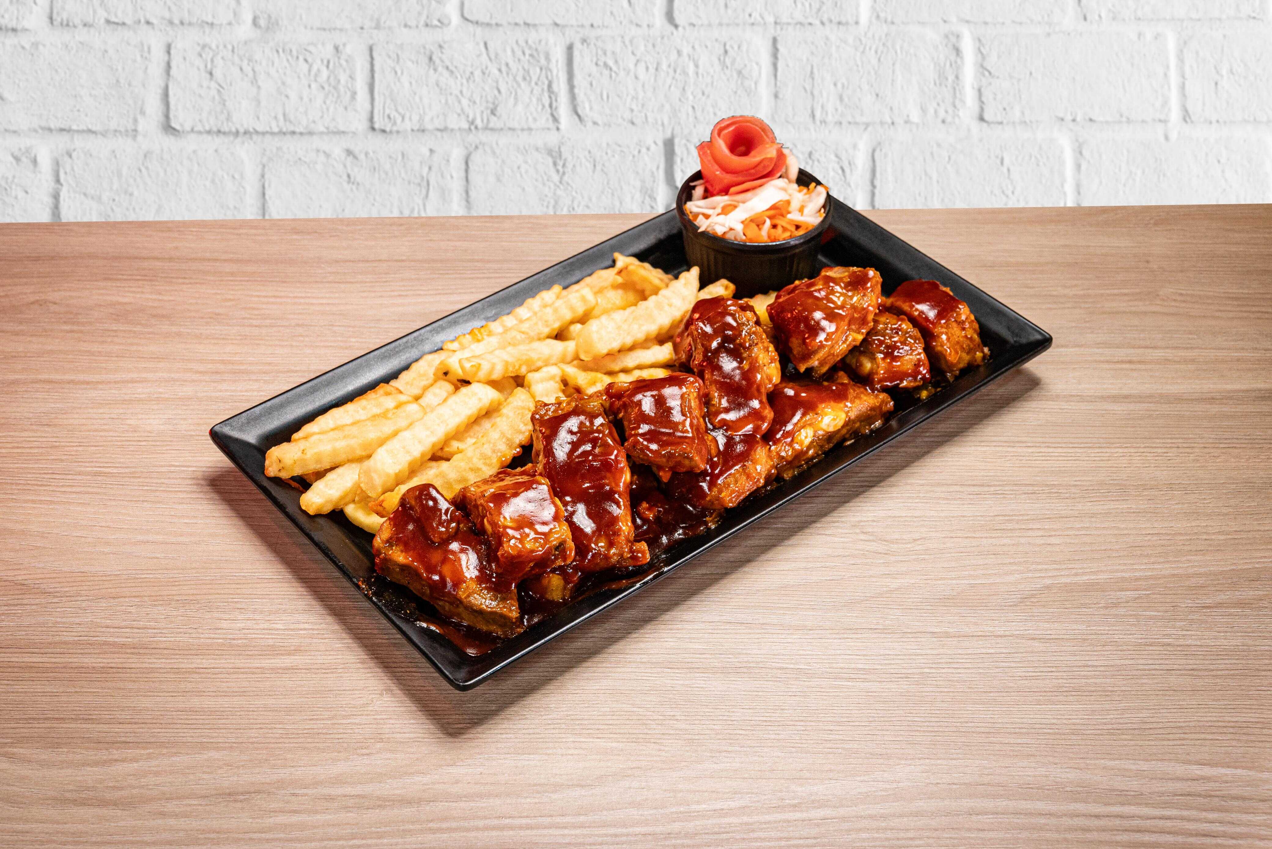 1.000 GRS de costilla ST. Louis en salsa BBQ acompañadas de papas rústicas y ensalada.