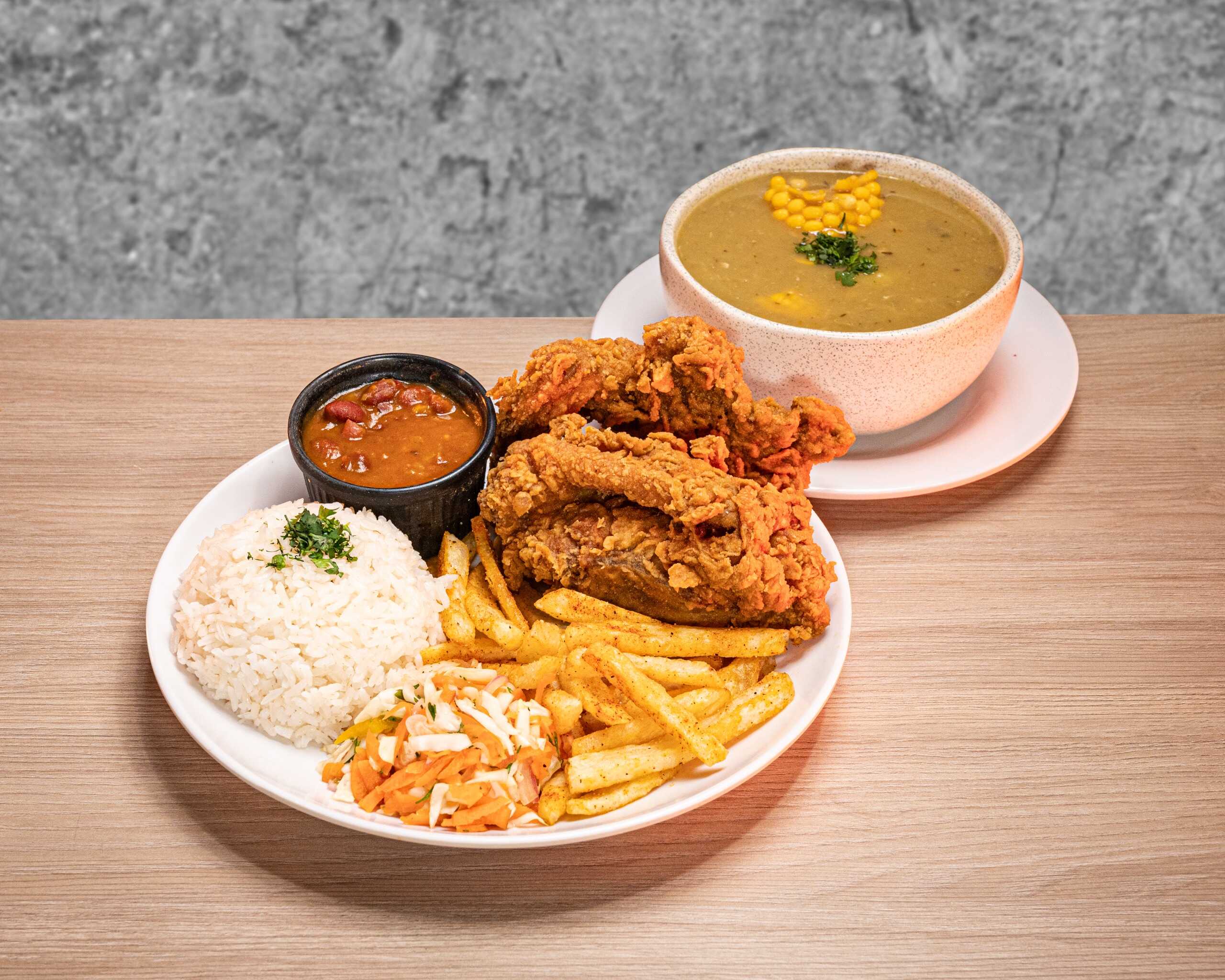 1/4 de pollo o proteína a elección, consomé, papas a la francesa, frijoles, arroz y ensalada.