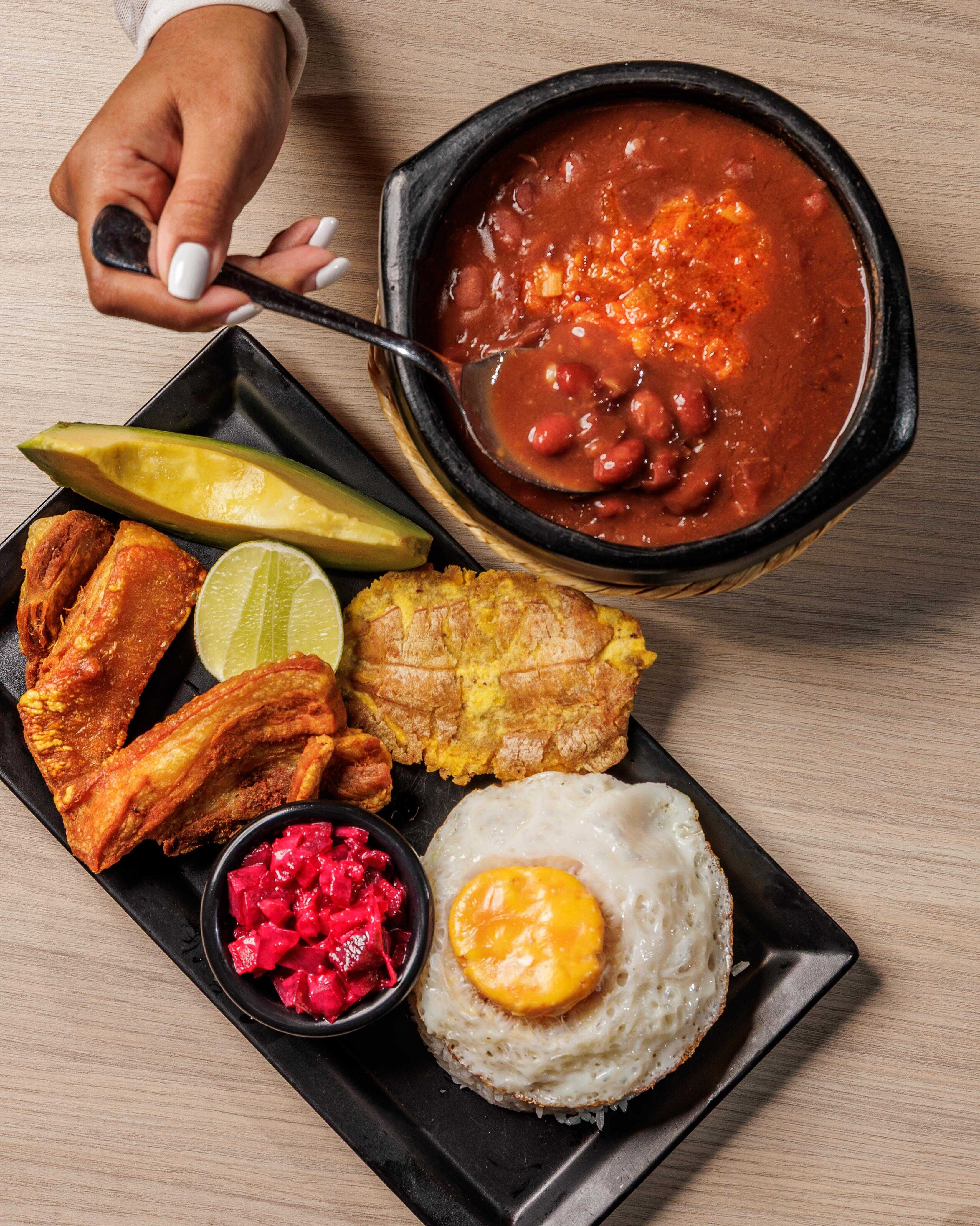 Frijoles rojos, carne molida, chicharrón, chorizo, huevo frito, arroz, arepa, plátano maduro frito y aguacate.