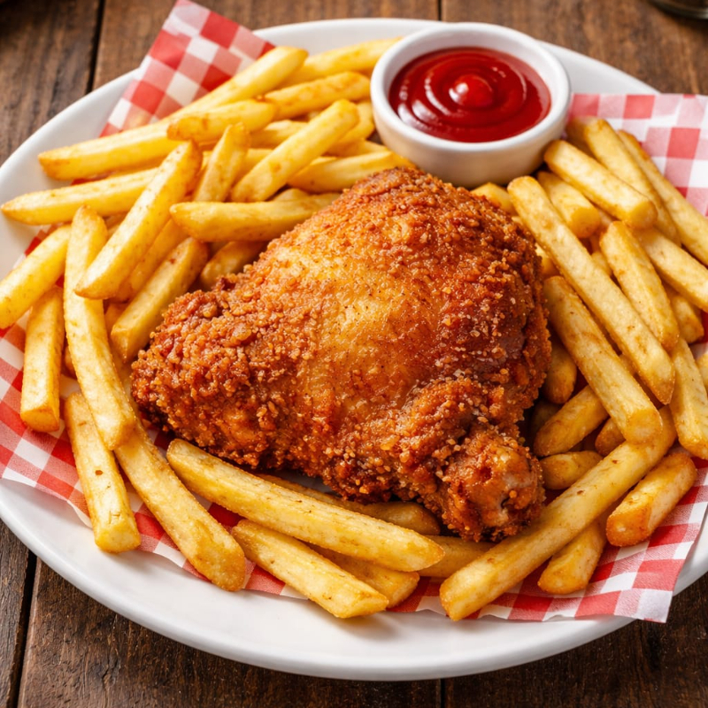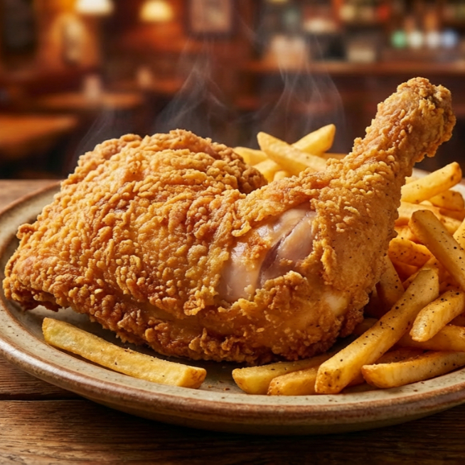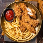 contamuslo apanado, papas a la francesa o amarilla (disponibilidad del producto) con salsas de la casa, roja, piña, bbq, rosada