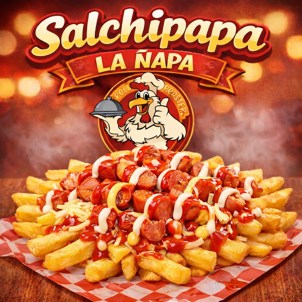 papa a la francesa o amarilla (disponibilidad del producto), salchilla, ripio y salsa verde, roja, bbq, piña y rosada