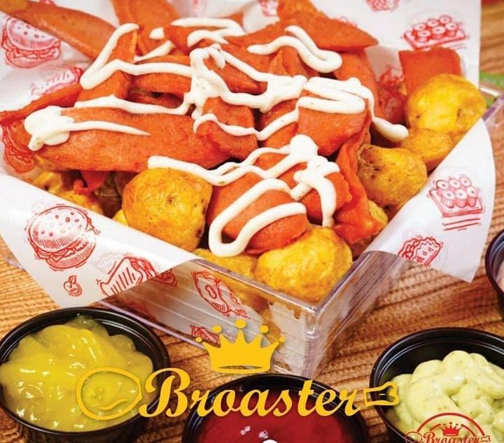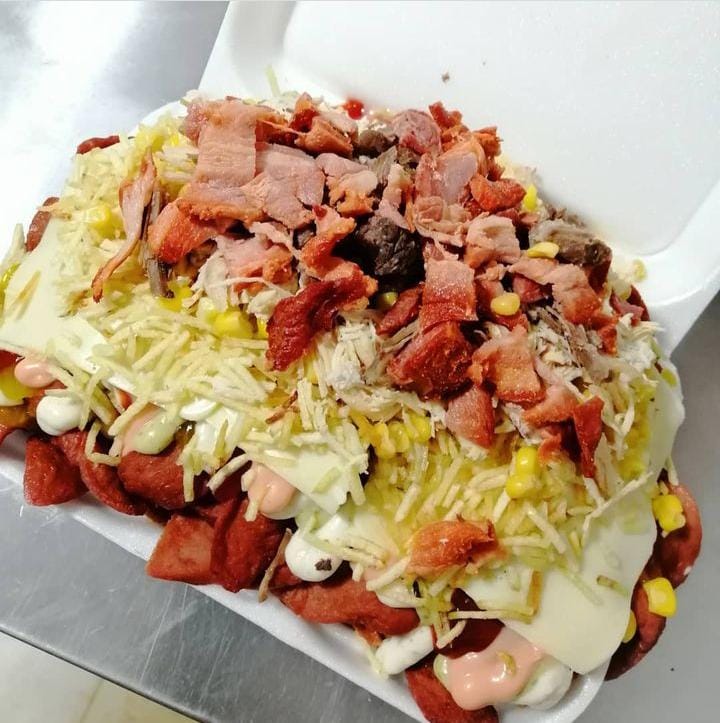 Papa amarilla, tocineta, carne de hamburguesa, pollo, chorizo, costilla, maduro y salsa BBQ.