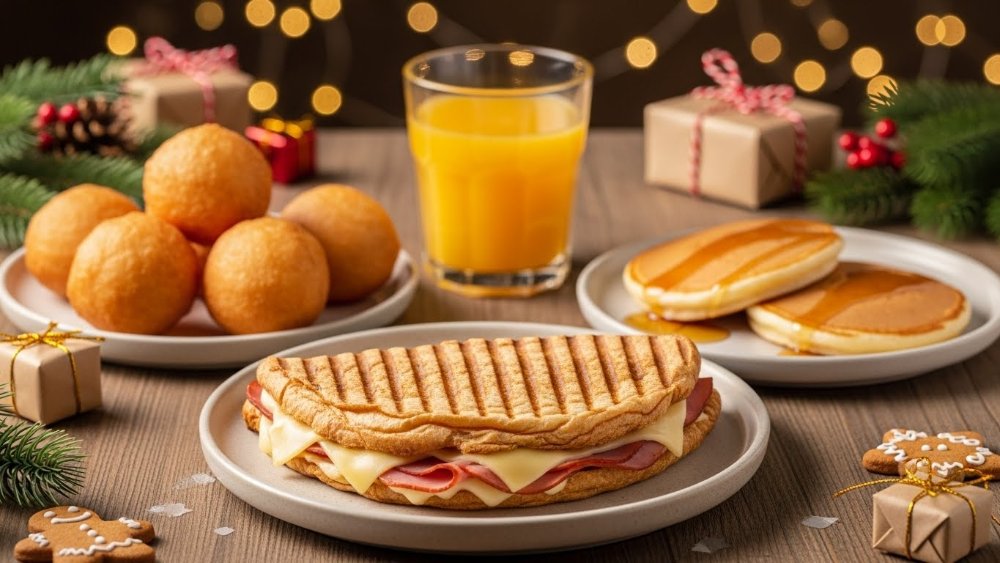 Combo Navideño para Compartir incluye un sándwich croissant prensado con jamón y queso, acompañado de 5 mini buñuelos, mini pancakes tradicionales y un jugo de naranja.