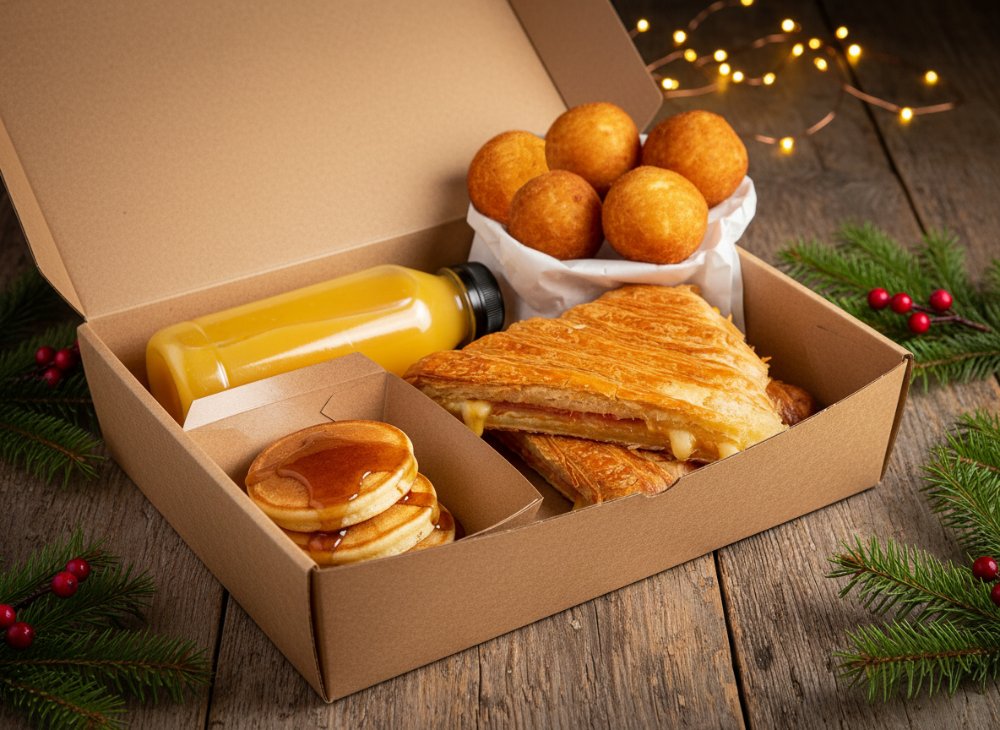Combo Navideño para Compartir: incluye un sándwich croissant prensado con jamón y queso, acompañado de 5 mini buñuelos, mini pancakes tradicionales y un jugo de naranja, todo empacado en una caja especial perfecta para regalar.