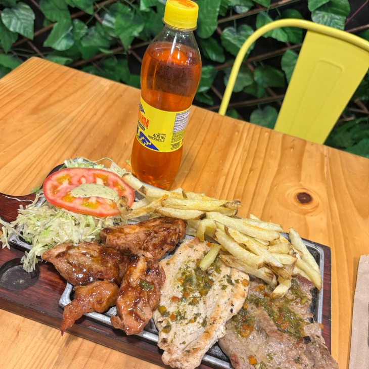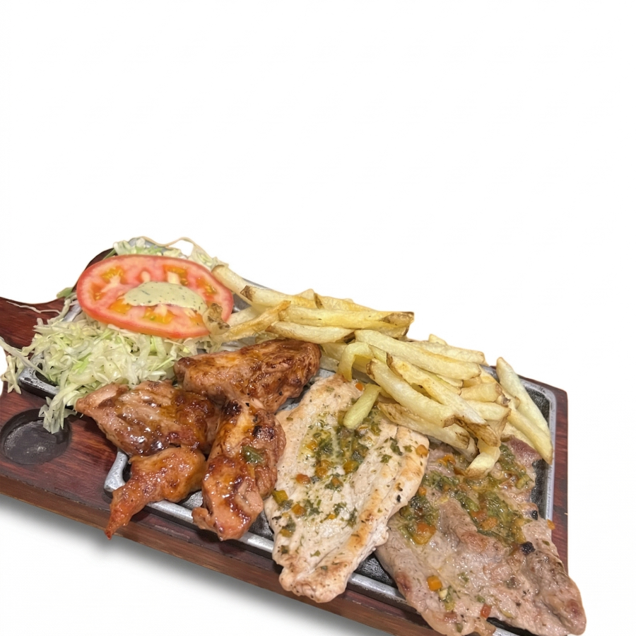 160gr de pollo, 160gr de res, 160gr de cerdo, 1 chorizo, 160gr de costilla bbq, acompañada de papa a la francesa, ensalada de la casa.