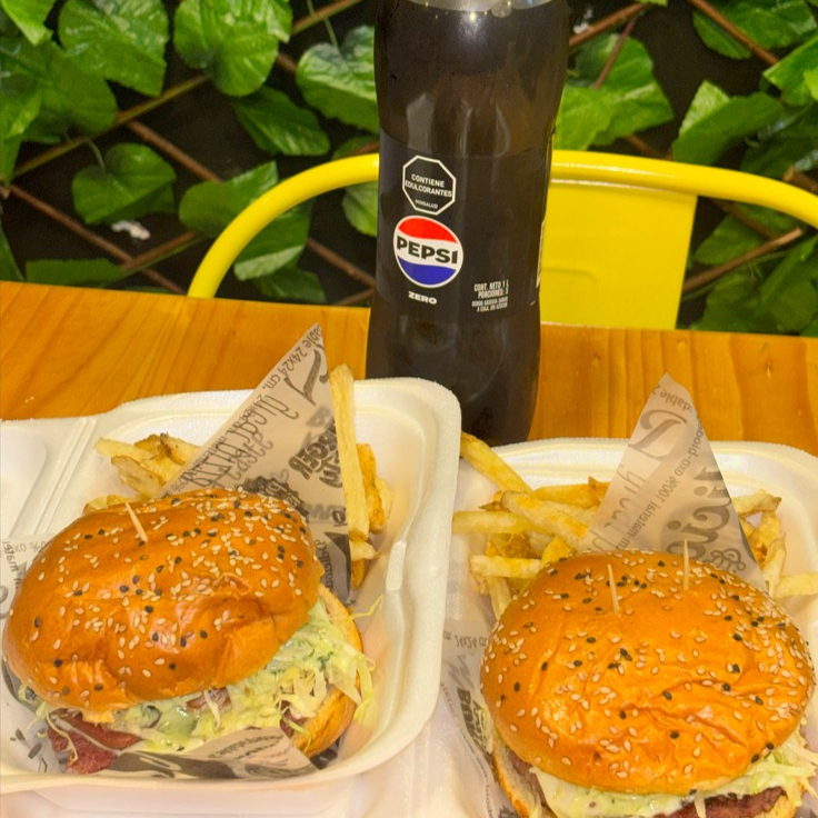 2 hamburguesas con Pan brioche, res, tocineta, cebolla grille, queso, ripio, lechuga, tomate. + 2 papas + Gaseosa Postobon 1L sabor a disposición de la tienda