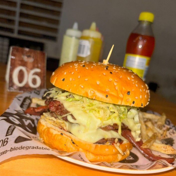 Pan brioche, doble carne de res, tocineta, queso, ripio, lechuga, tomate.