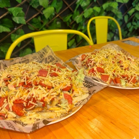 Salchicha Zenù, chicharròn, 160gr de cerdo, ripio, tocineta, maicitos, papa francesa, queso gratinado.