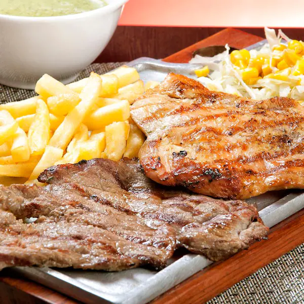 Filete de pollo, carne de res, maíz, ripio, lechuga y queso rallado.