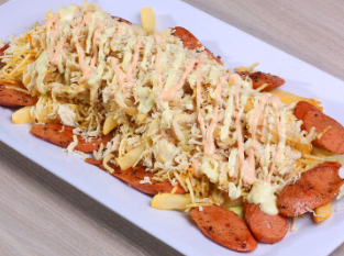 Chorizo ( res o Pollo ), ripio, tocineta, lechuga, papa francesa, queso rallado.