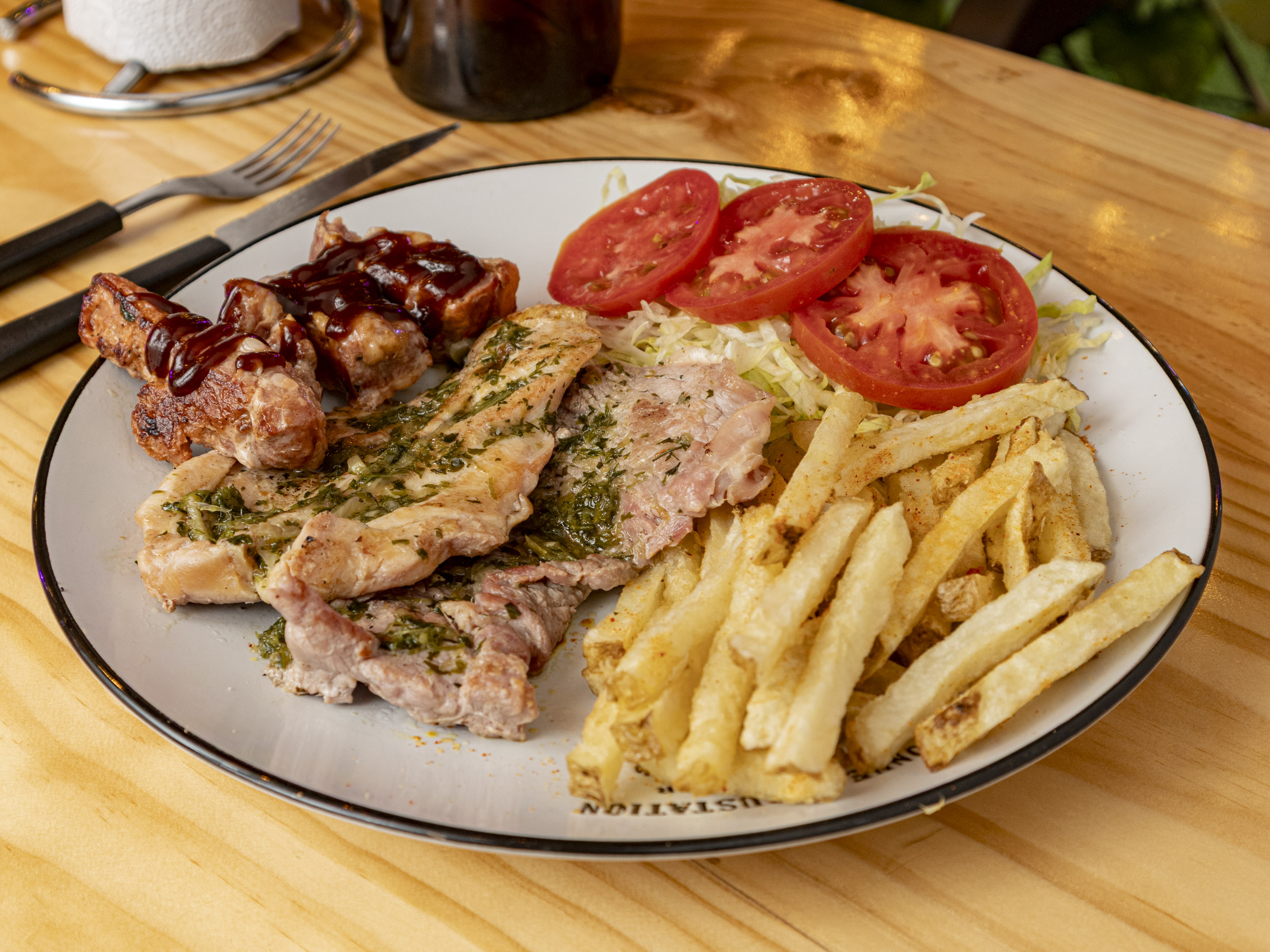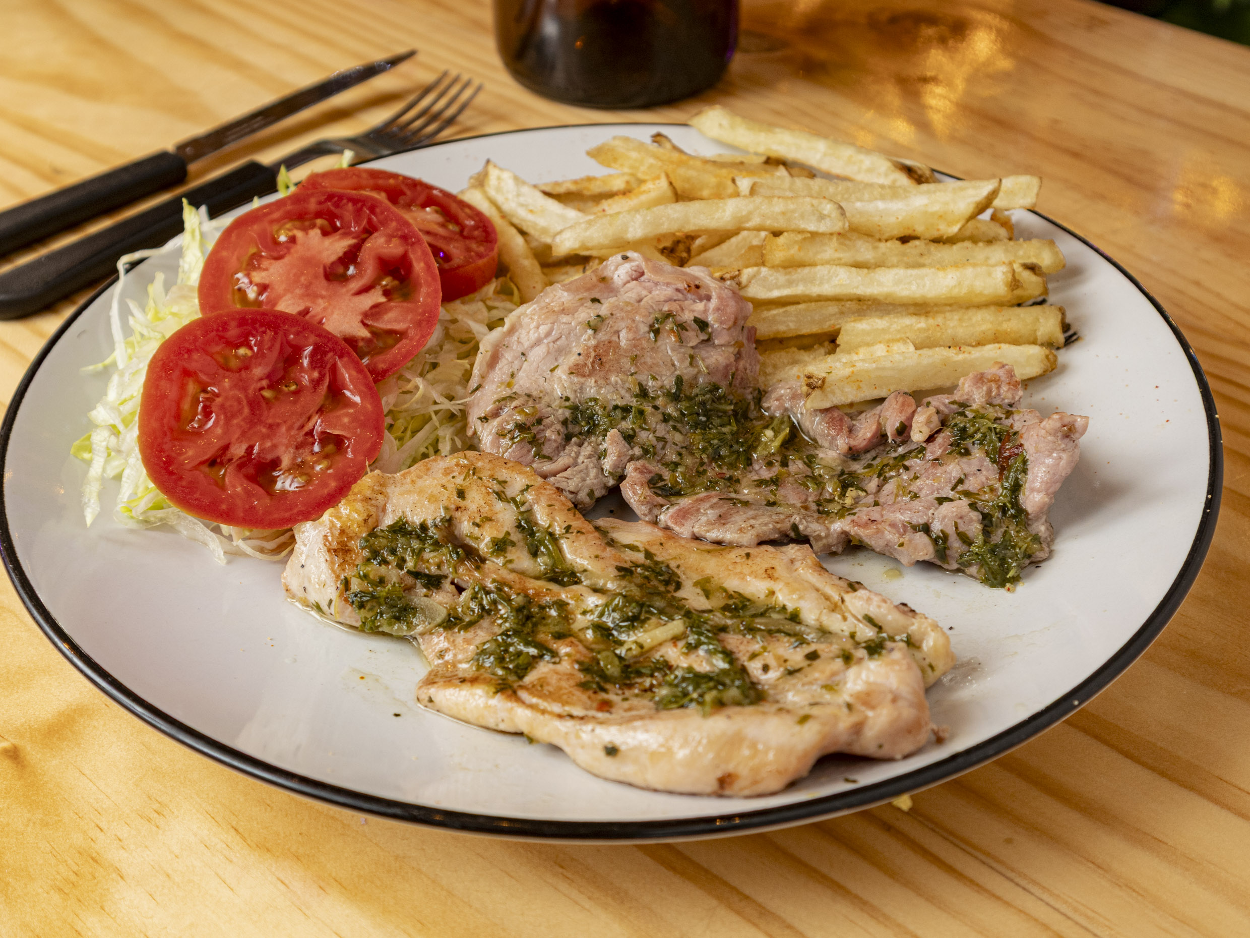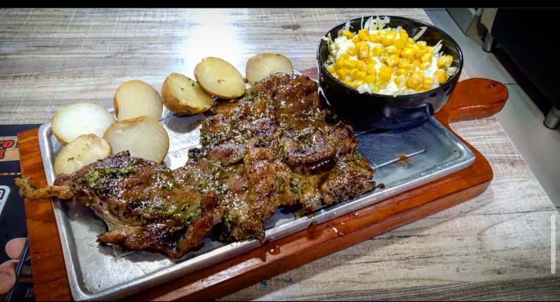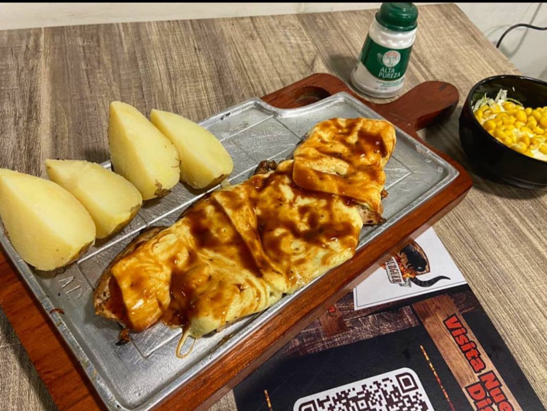 Costilla de búfalo filete de pollo, carne de res, maíz, ripio, lechuga y queso rallado.