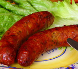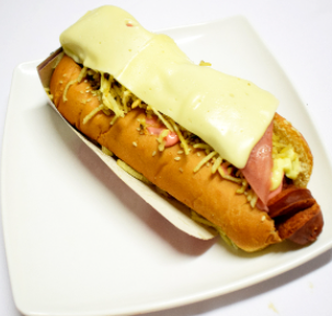 Pan briochet, chorizo (res o pollo), queso, tocineta, ripio y lechuga.
