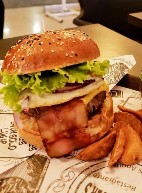 Pan artesanal, carne angus 200 g, tocineta, queso americano, aro de cebolla, huevo, tomate, cebolla, lechuga crespa.