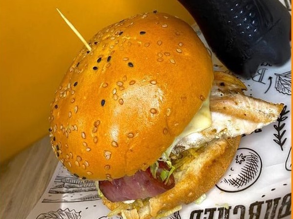 Pan de hamburguesa, pollo desmechado, tocineta, ripio, jamón y queso.