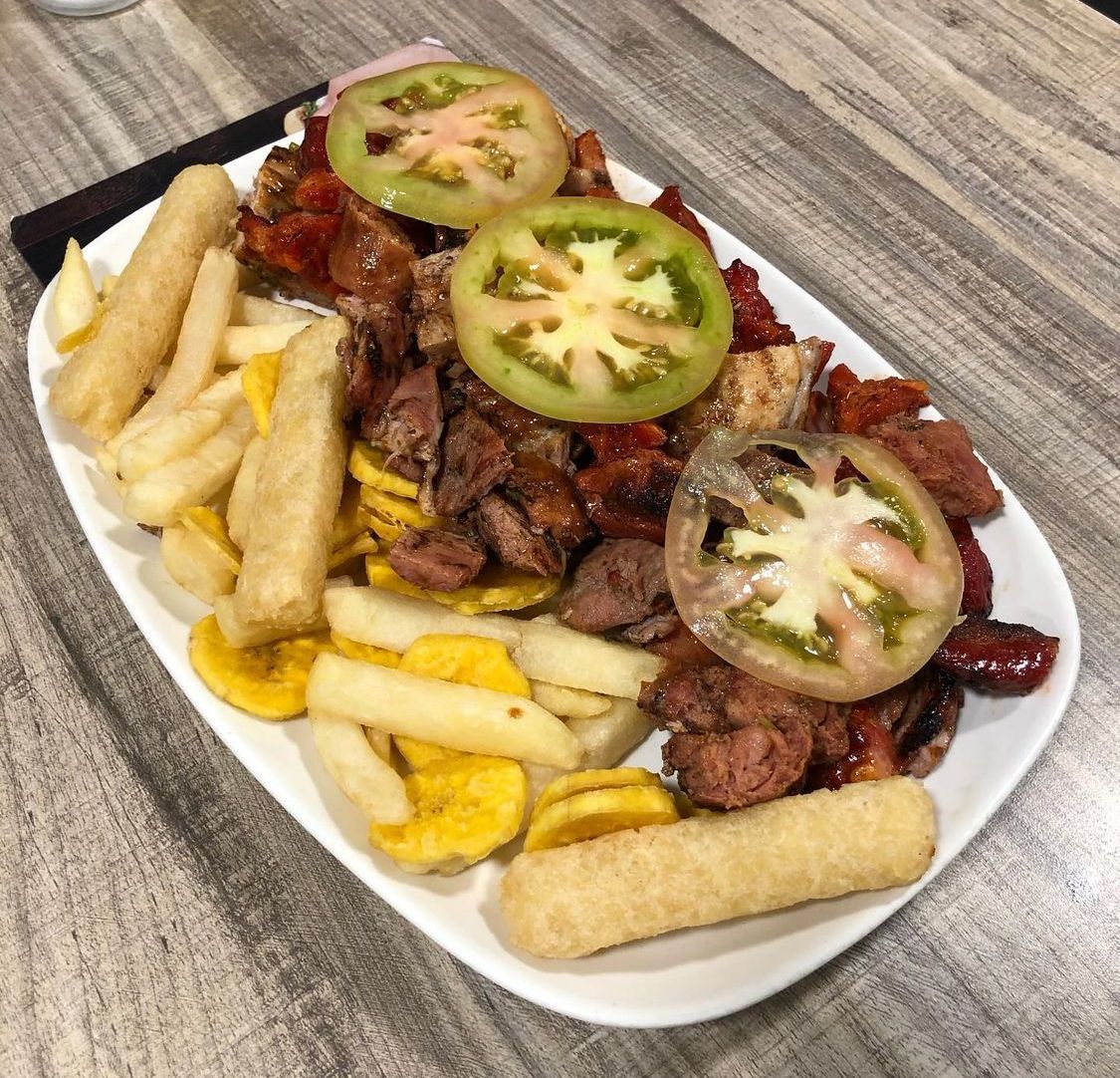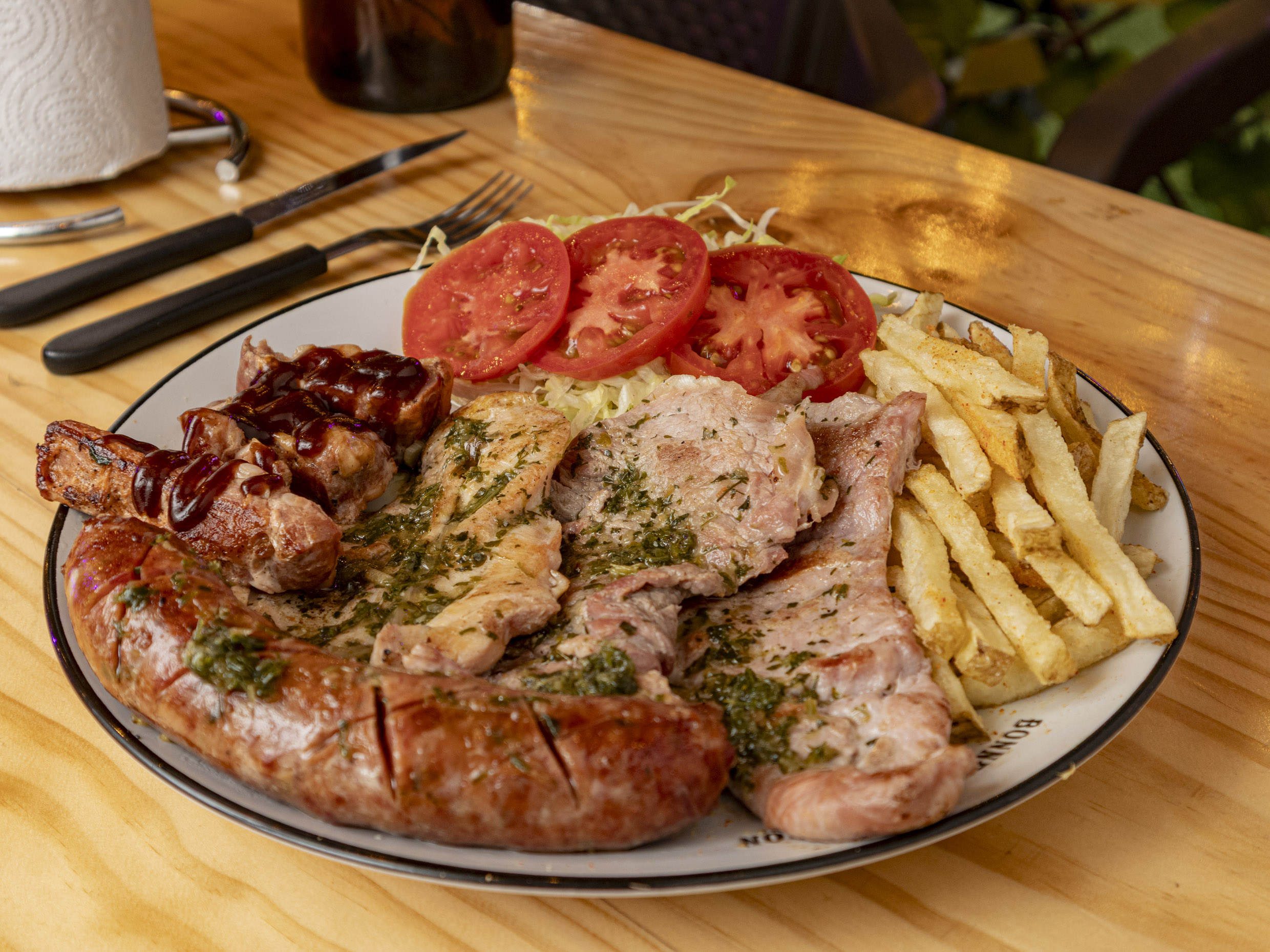 Salchicha zenú, chorizo, costilla ahumada BBQ, carne de res, filete de pollo, ripio, tocineta, maíz, lechuga, papa francesa, queso rallado.