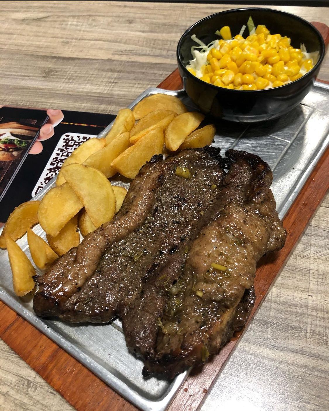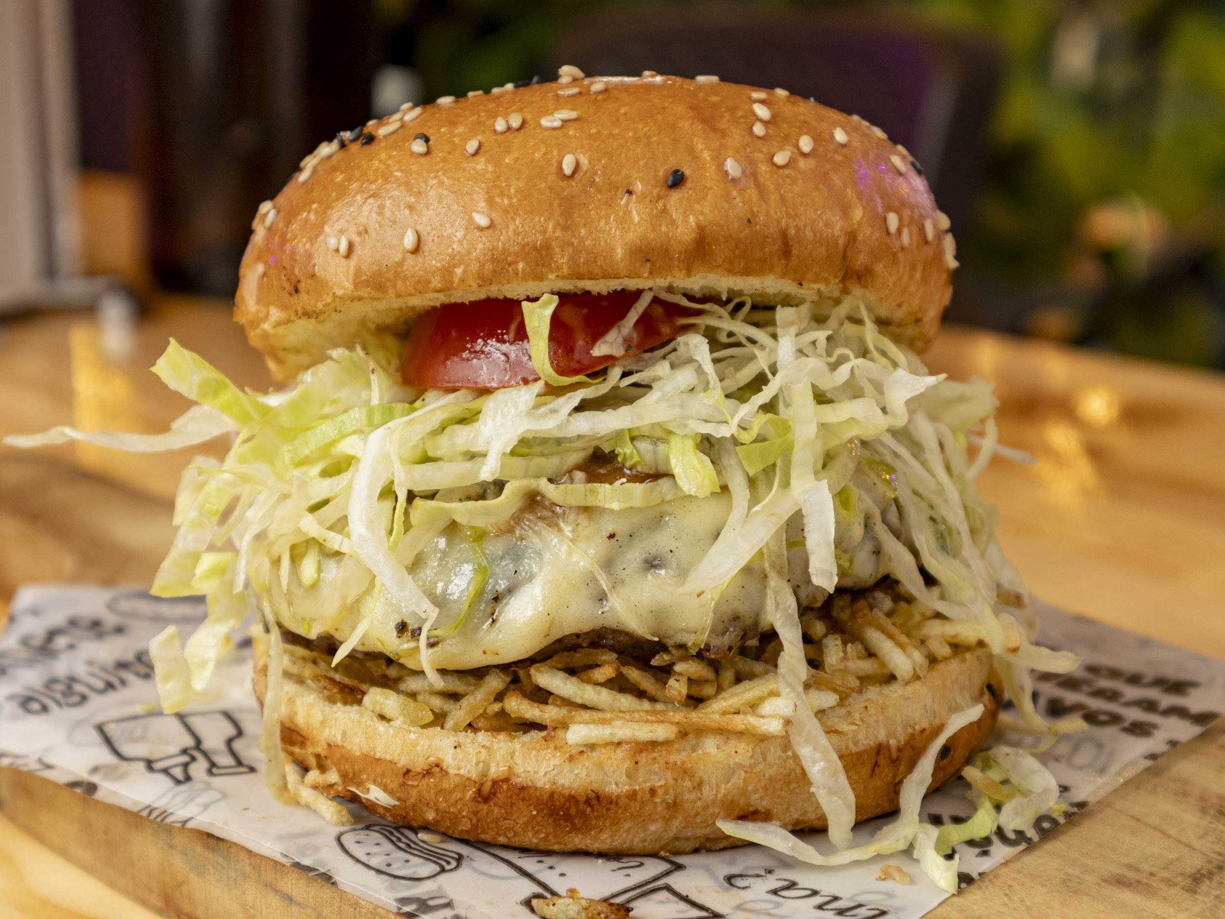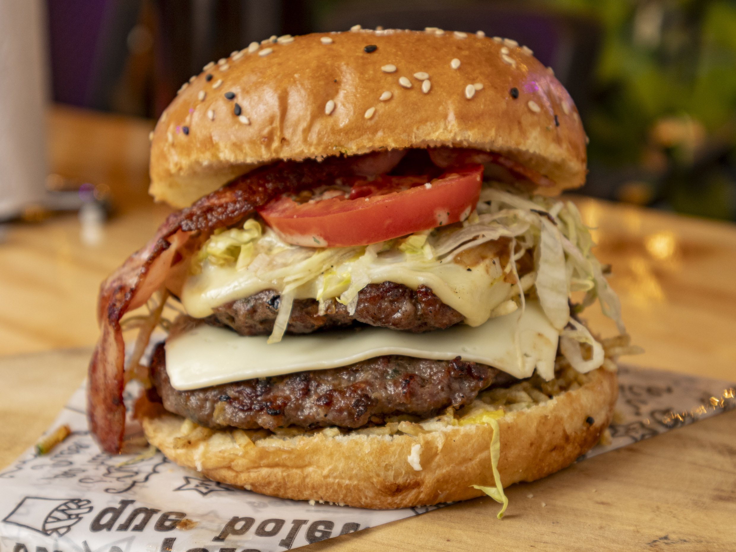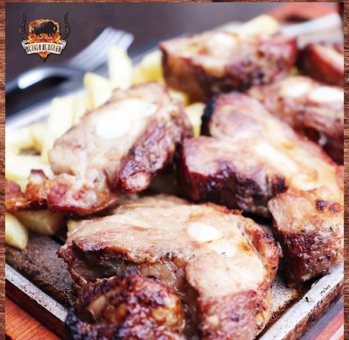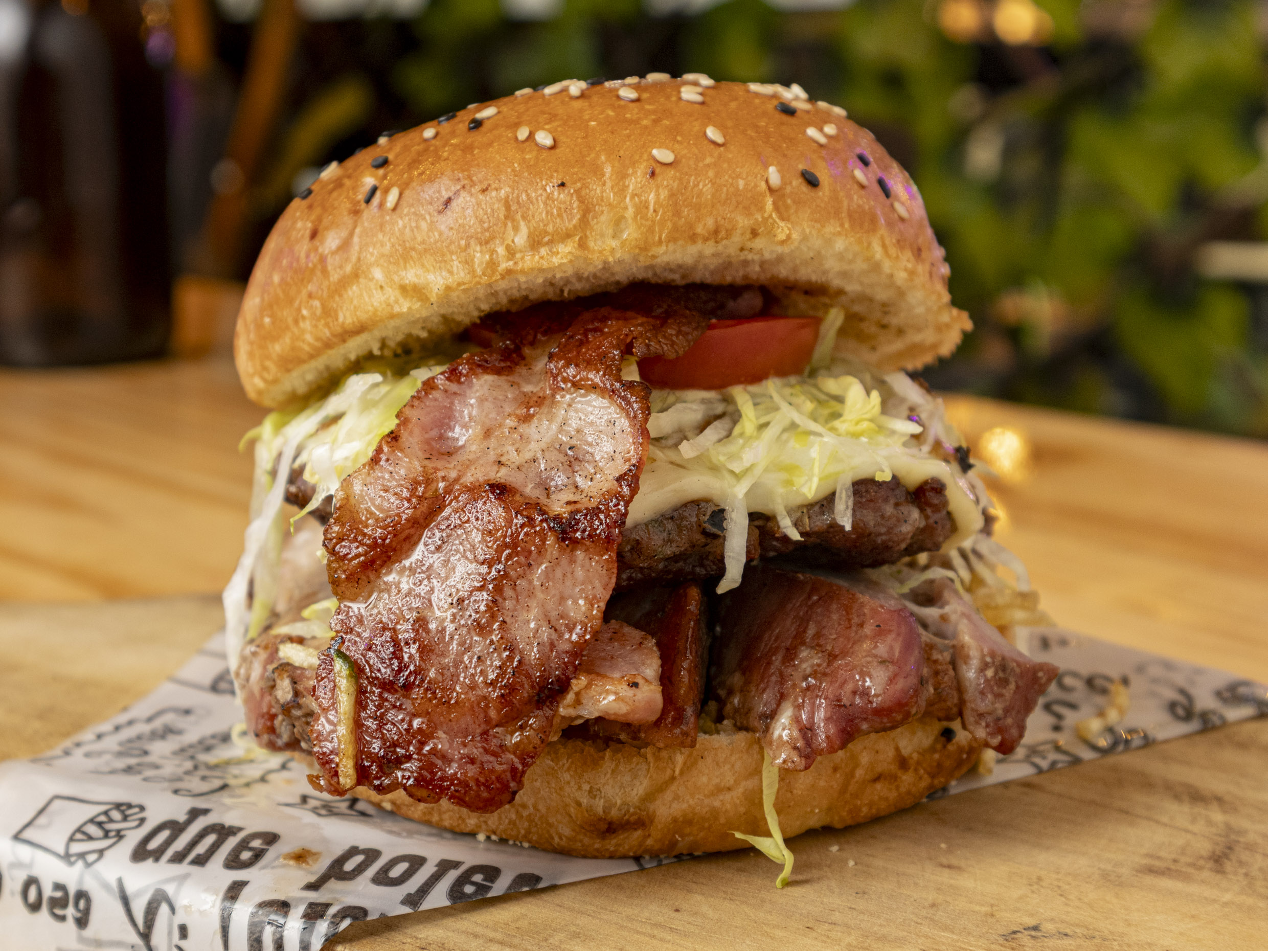 Pan briochet, costilla de búfalo, res, queso, tocineta, ripio, lechuga y tomate.