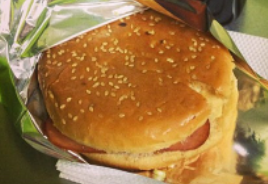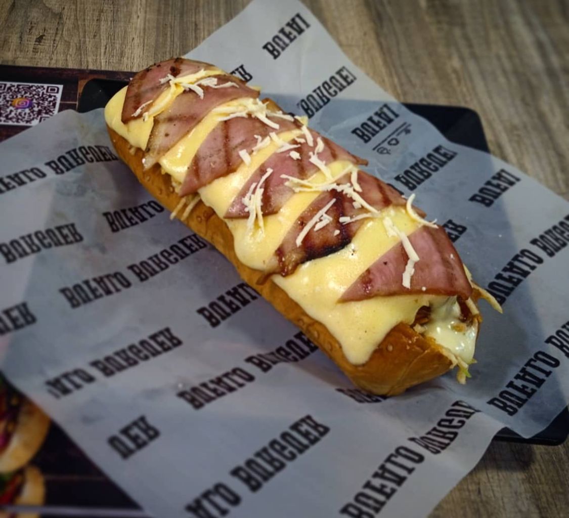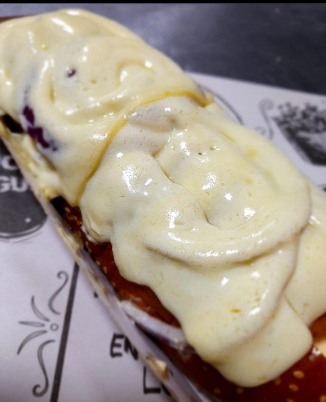 Pan de hamburguesa, costilla de búfalo, ripio, jamón y queso.