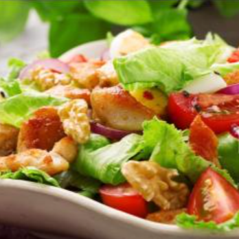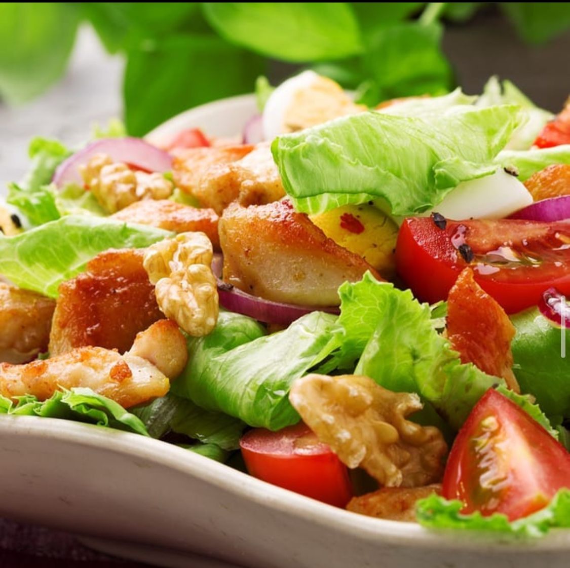 Filete de pollo, maíz, ripio, lechuga y queso rallado.