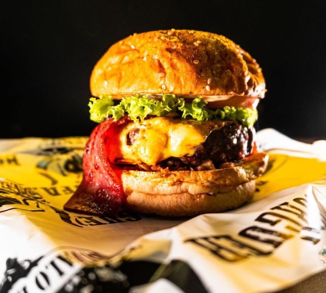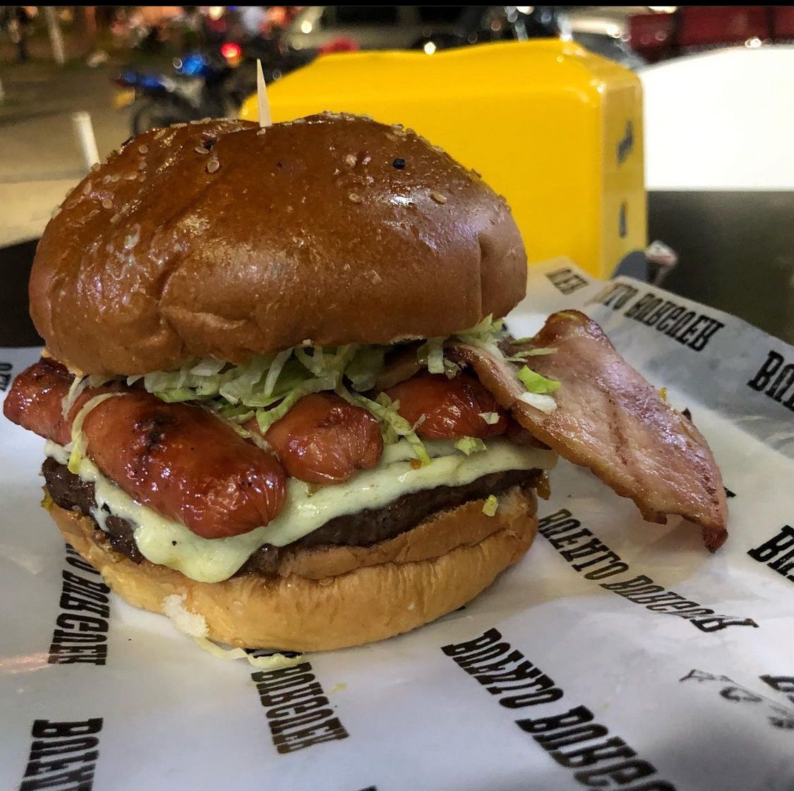 Pan brioche, carne de res, doble salchicha ranchera, tocineta premium, queso fundido, lechuga, salsa de la casa, ripio de papa.