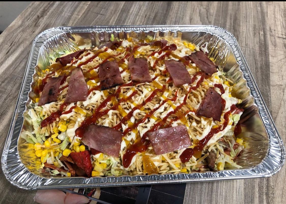 Costilla ahumada BBQ, maíz, ripio, lechuga y queso rallado.