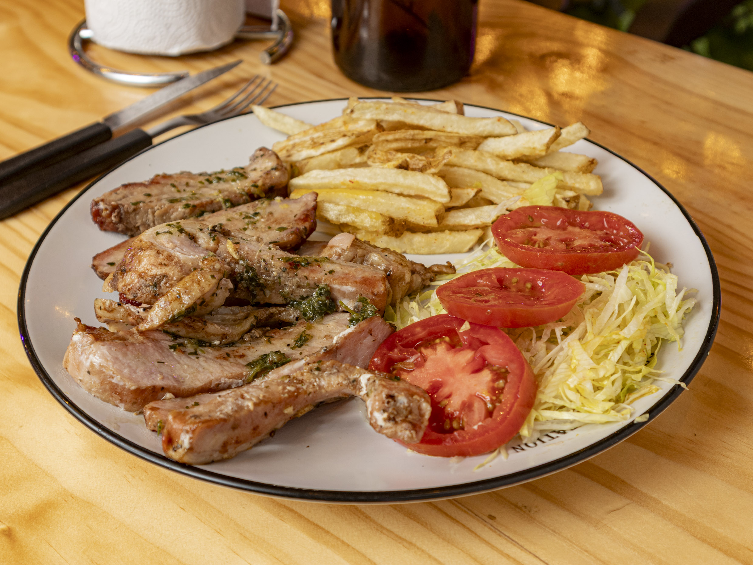 Costilla de bufalo, maíz, ripio, lechuga y queso rallado.