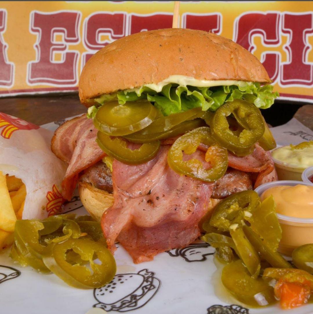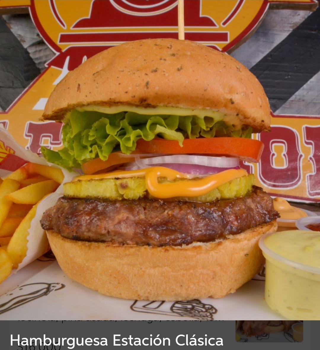 Pan artesanal, 150 g de carne, queso, tocineta, piña asada, lechuga, cebolla, jalapeños, chipotle, pimienta, tomate y salsas de la casa más porción papas.