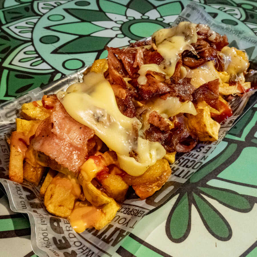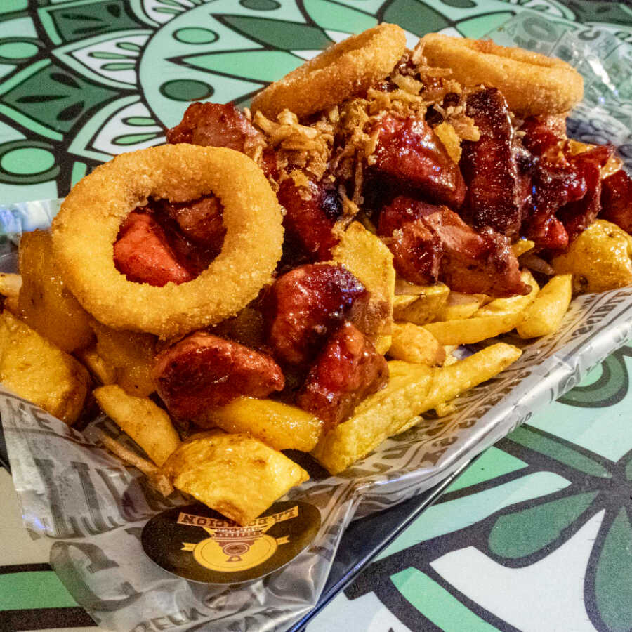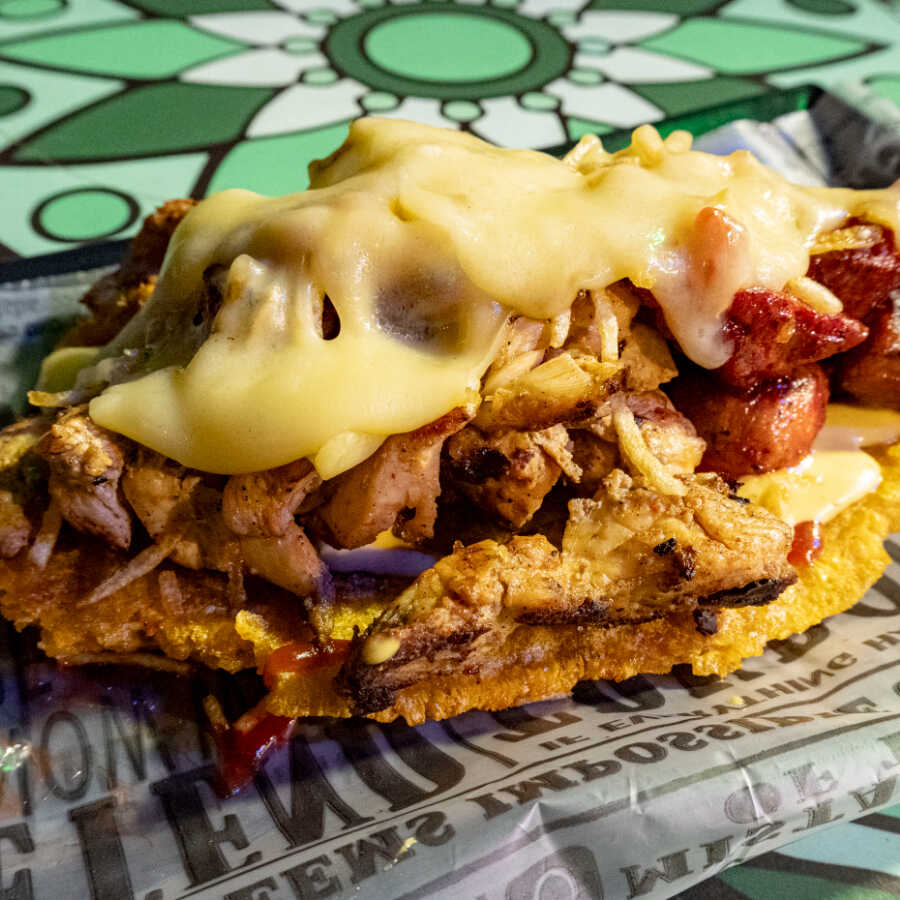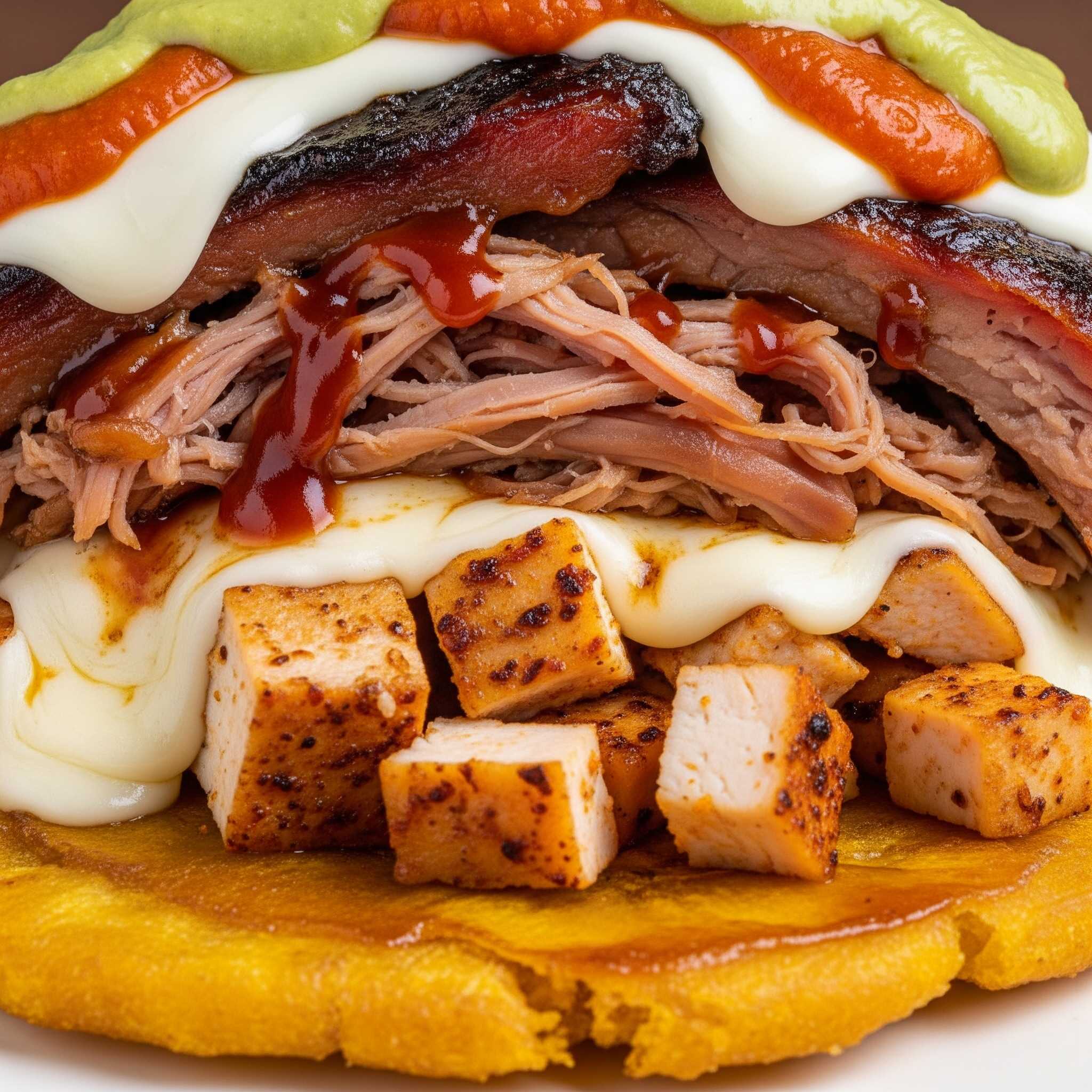 Plátano verde, costilla BBQ, pollo en trozos, queso fundido, ripio de papa, salsas premium.