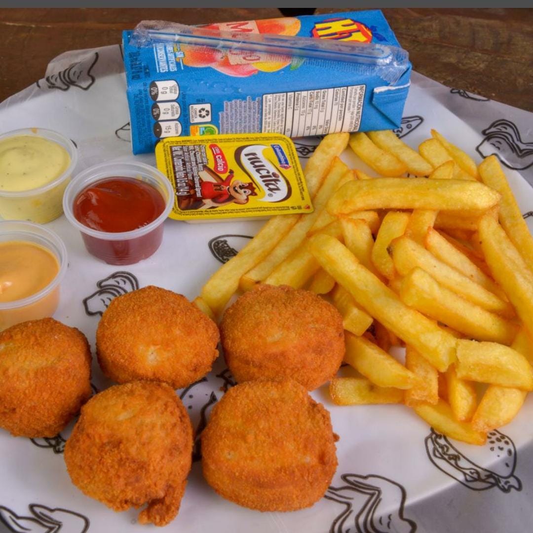 Nuggets de pollo, papas a la francesa, salsas premium, jugo Hit personal de caja y golosina.