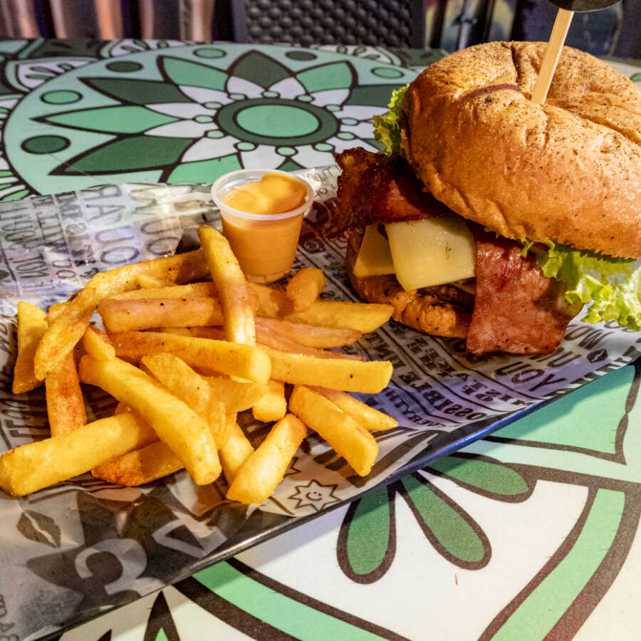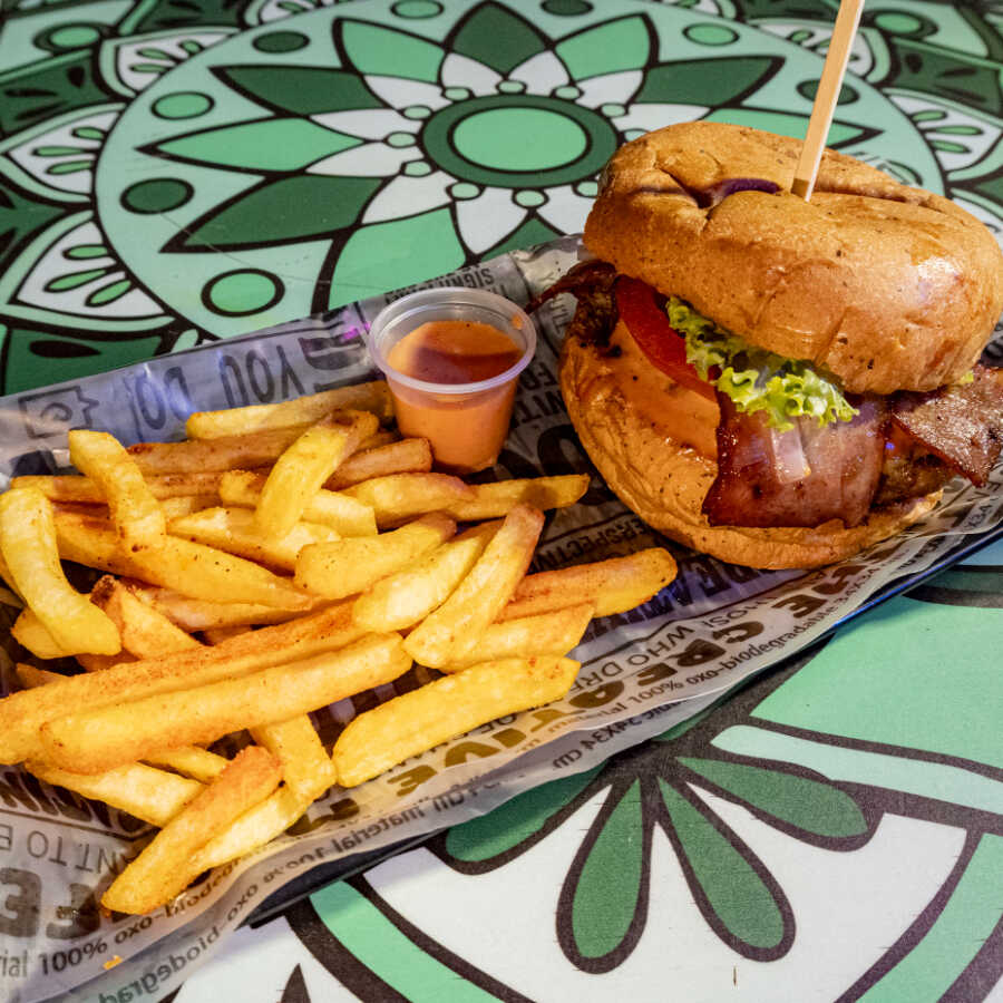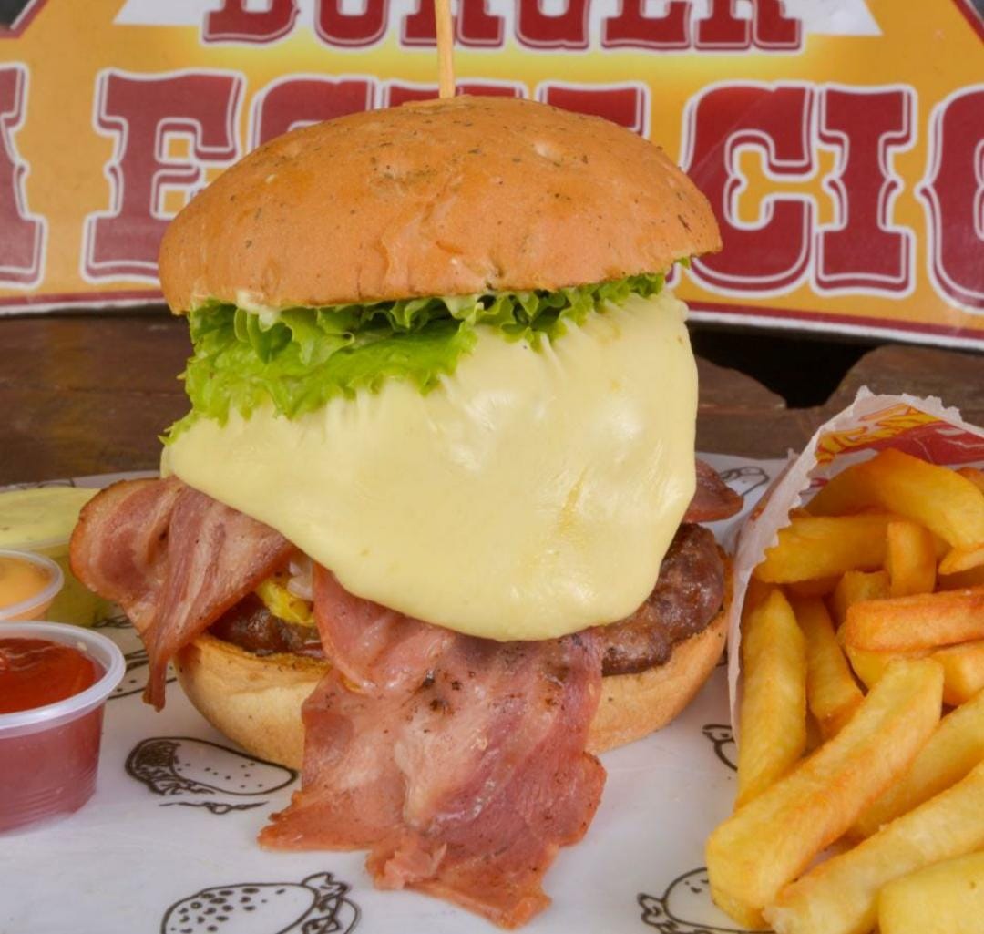Pan artesanal, 150 g de carne, tajadas de maduro bañadas con queso, tocineta, lechuga, cebolla, tomate y salsas de la casa más porción papas.