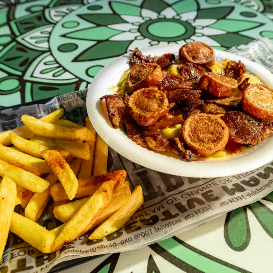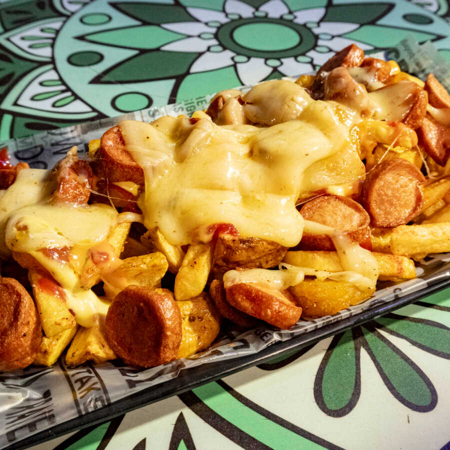 Salchipapa Queso Tocino