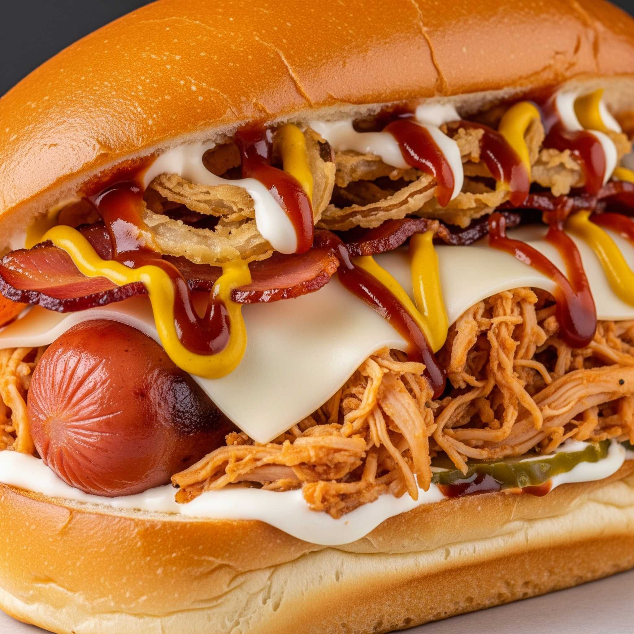 Pan brioche, salchicha americana, pollo en trozos, doble queso mozzarella, tocineta, cebolla frita, ripio de papa y salsas al gusto.