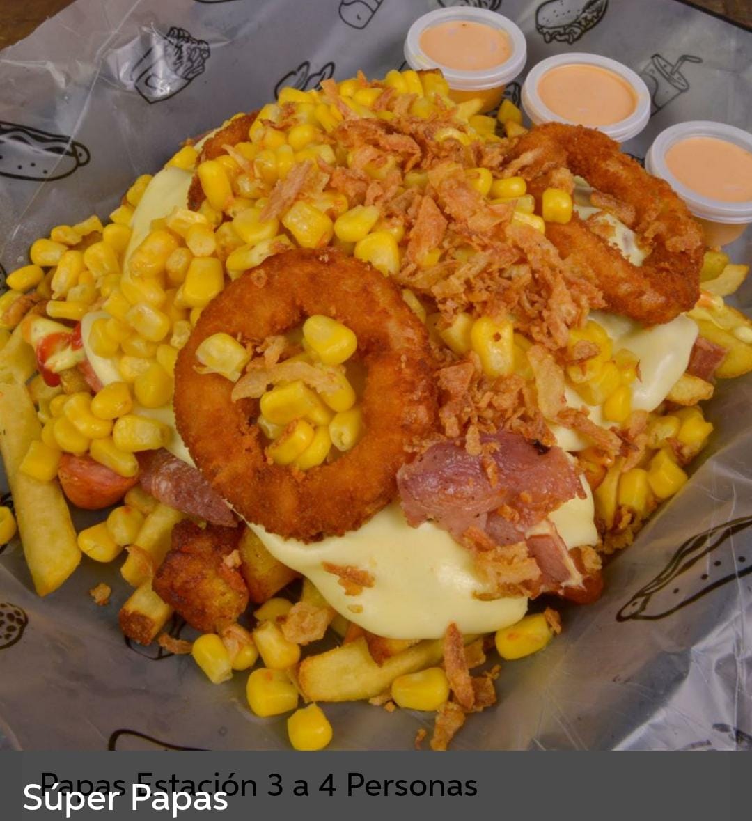 Papas a la francesa, papa criolla, queso fundido, salchicha campesina, tocineta, maduro y salsas de la casa.