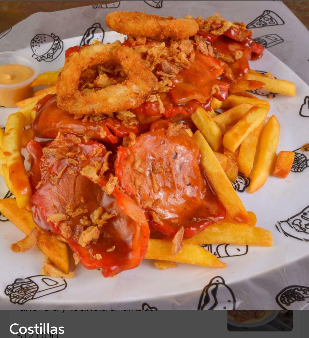 Pan brioche, salchicha americana, costilla en trozos, doble queso mozzarella, tocineta, cebolla frita, ripio de papa y salsas al gusto.