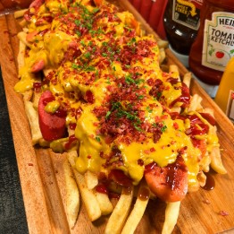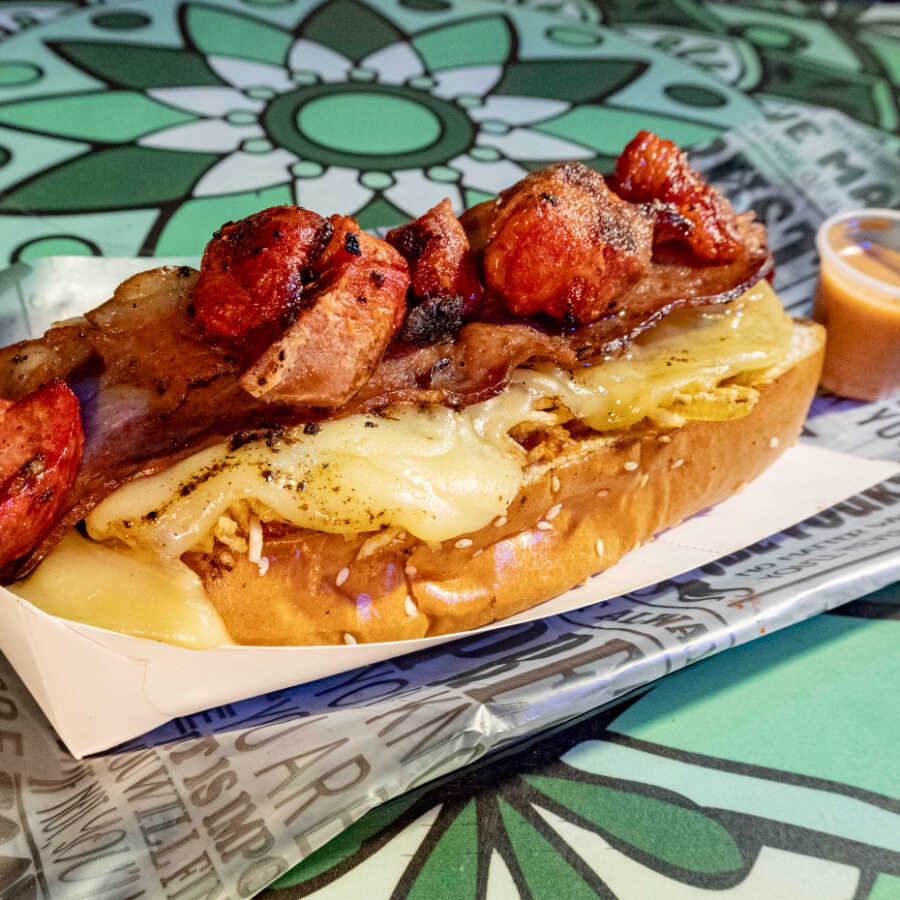 Pan brioche, salchicha americana, maduro en trozos, doble queso mozzarella, tocineta, cebolla frita, ripio de papa y salsas al gusto.