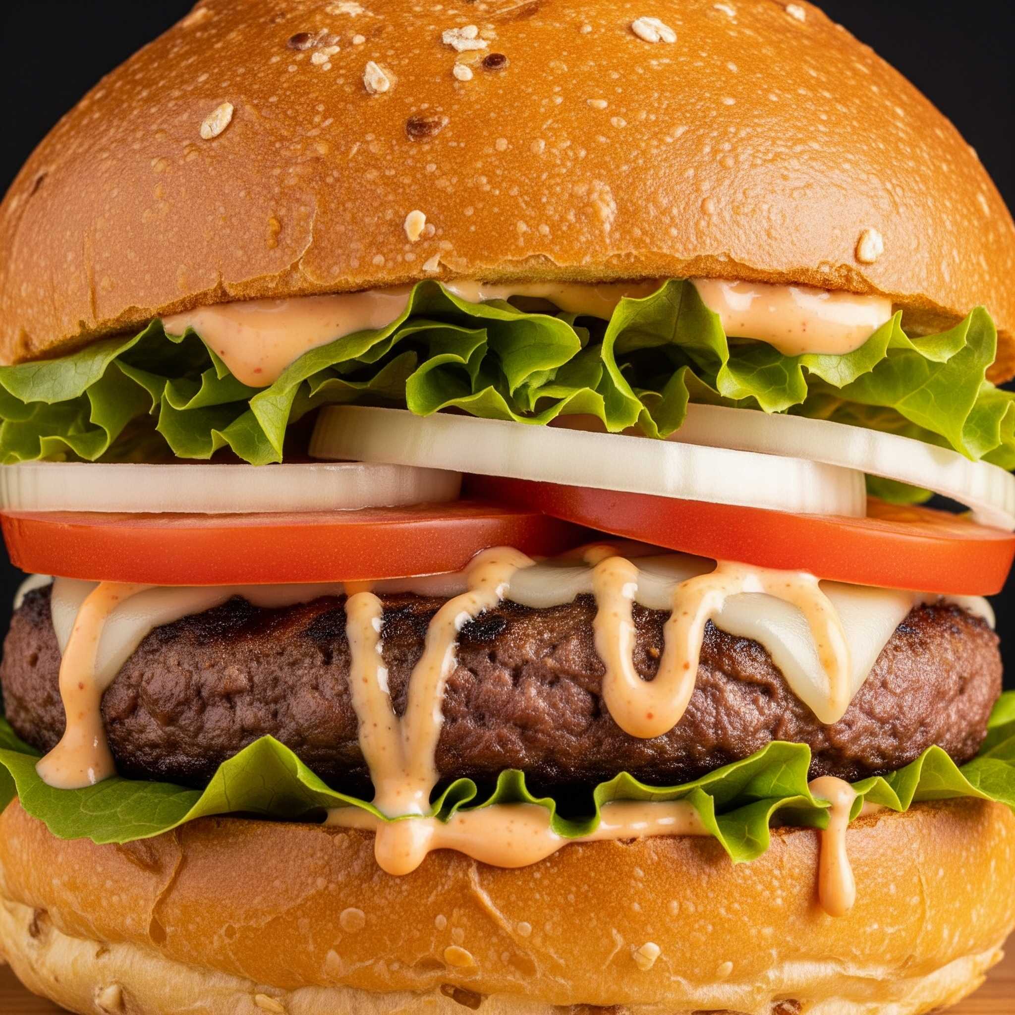 Pan artesanal, 150 g de carne de res más 150 g de carne de pollo, queso, tocineta, lechuga, cebolla, tomate y salsas de la casa más porción papas.