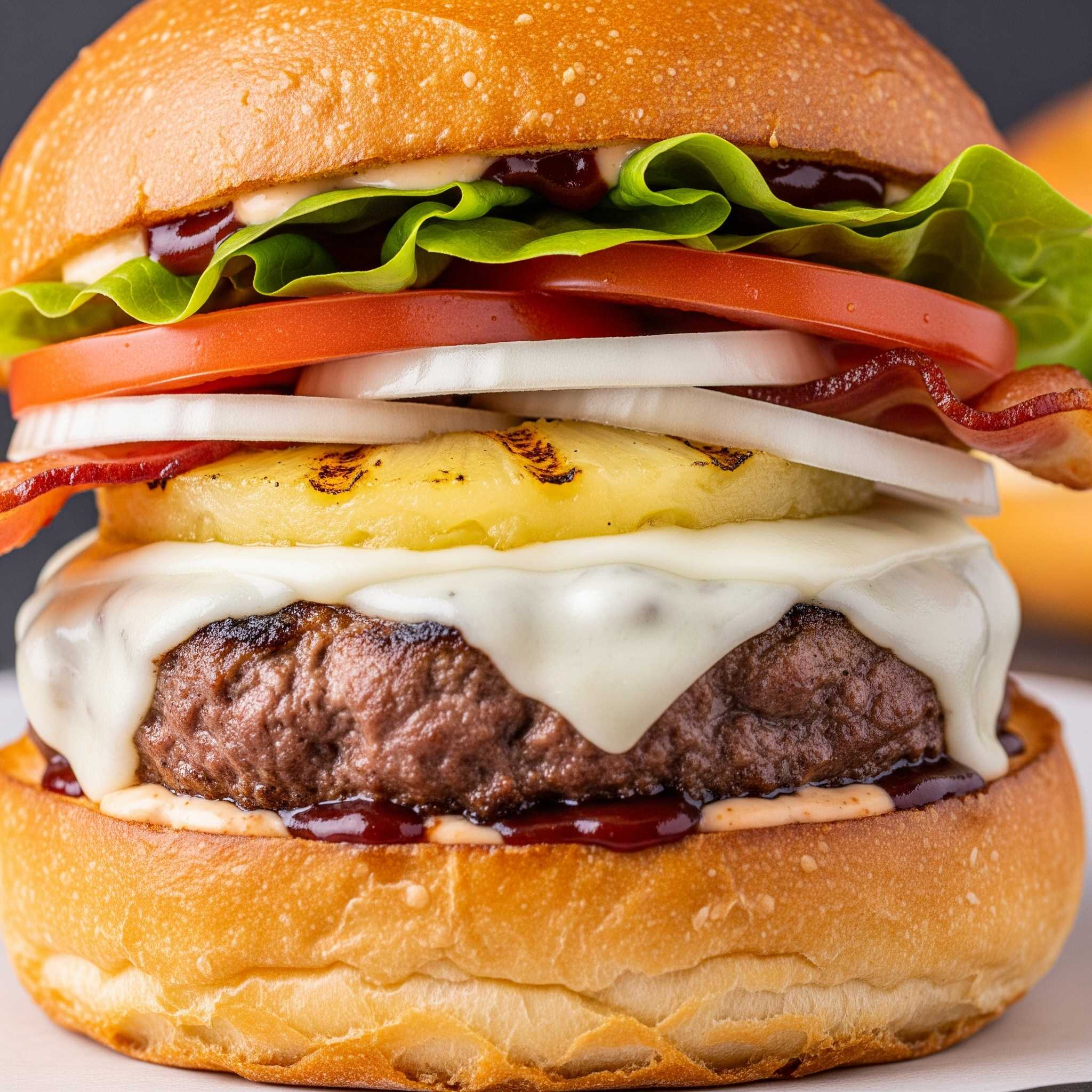 Pan artesanal, 150 g de carne, queso, tocineta, piña asada, lechuga, cebolla, tomate y salsas de la casa más porción papas.