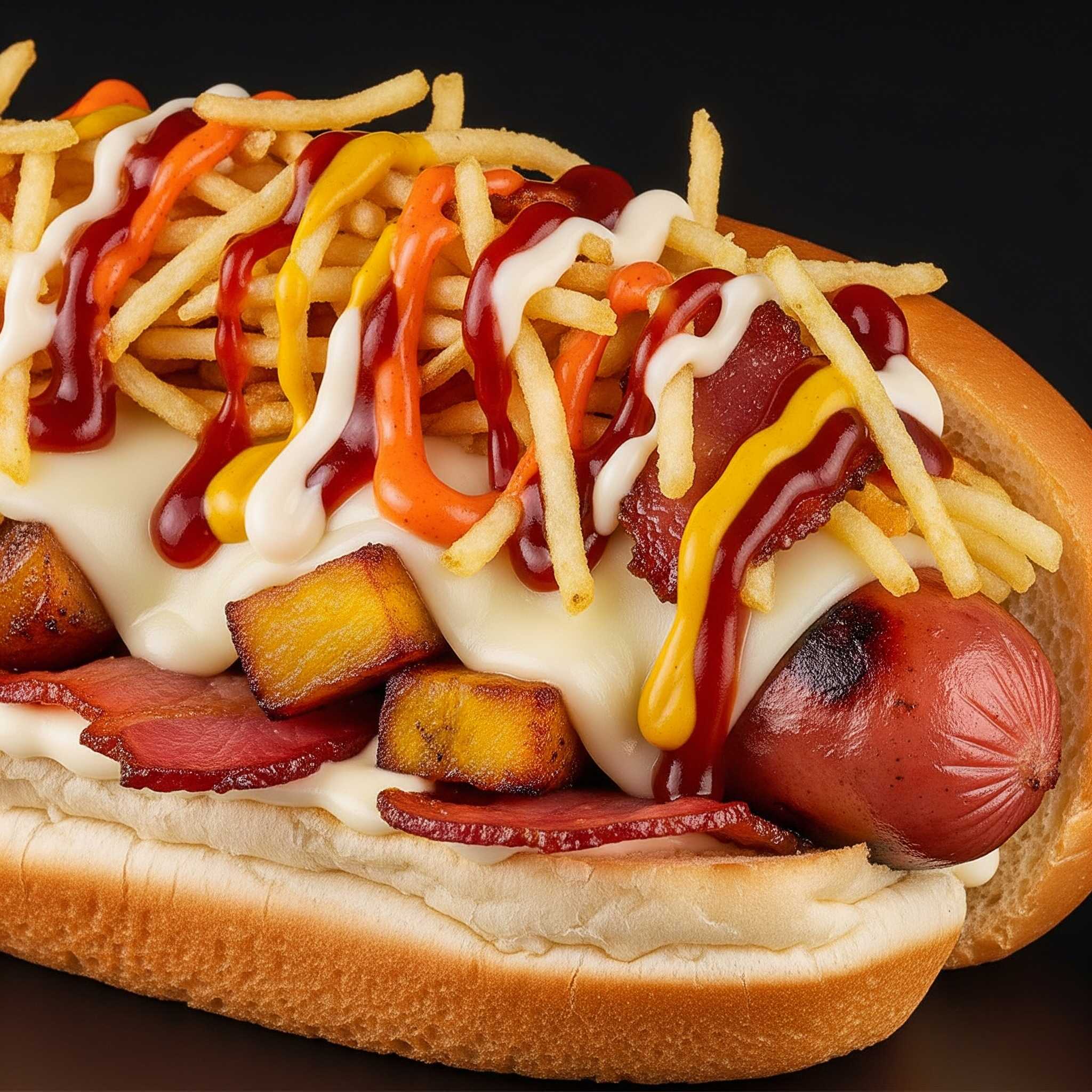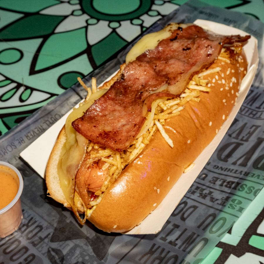 Pan brioche, salchicha americana, jalapeño, salsa chipotle, doble queso mozzarella, tocineta, cebolla frita, ripio de papa y salsas al gusto.